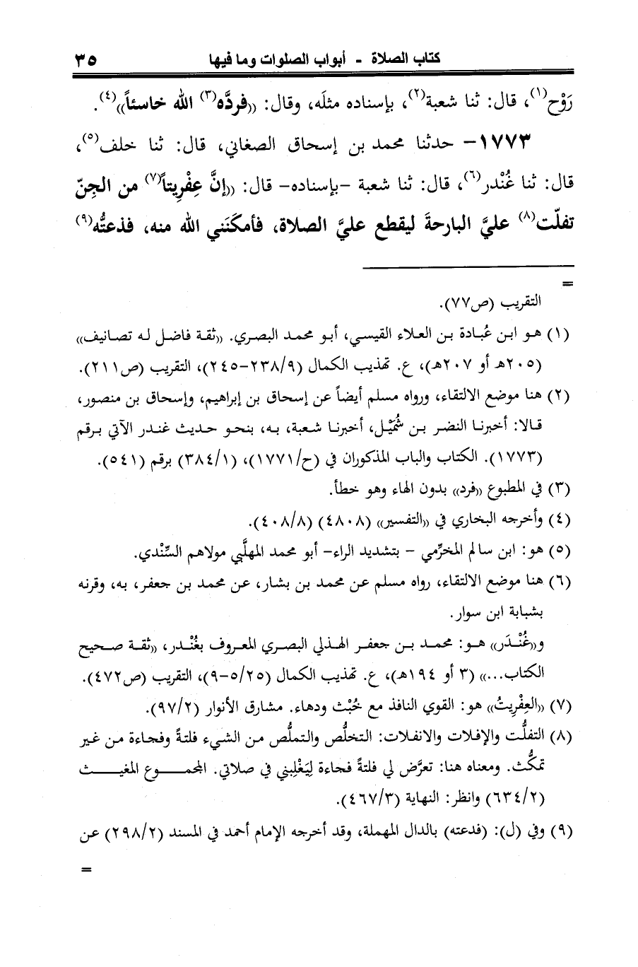 1773 - حدثنا محمد بن إسحاق الصغاني، قال: ثنا خلف (¬1)، قال: ثنا غُنْدر (¬2)، قال: ثنا شعبة -بإسناده- قال: "إنَّ عِفْرِيتًا (¬3) من الجِنّ تفلّت (¬4) عليَّ البارحةَ ليقطع عليَّ الصلاة، فأمكَنَني الله منه، فذعتُّه (¬5)