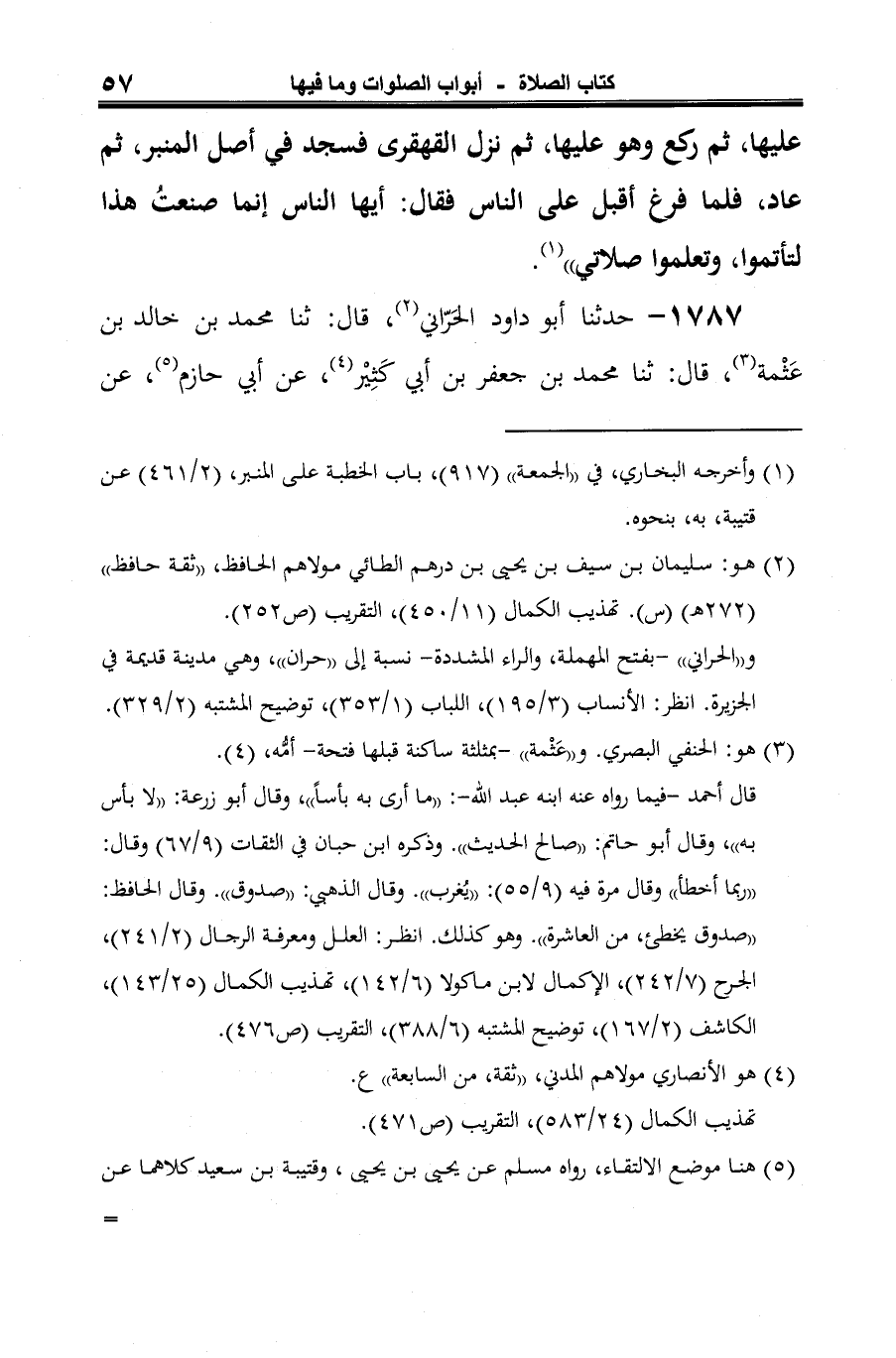1787 - حدثنا أَبو داود الحَرّاني (¬1)، قال: ثنا محمد بن خالد بن عَثْمة (¬2)، قال: ثنا محمد بن جعفر بن أبي كَثِيْر (¬3)، عن أبي حازم (¬4)، عن