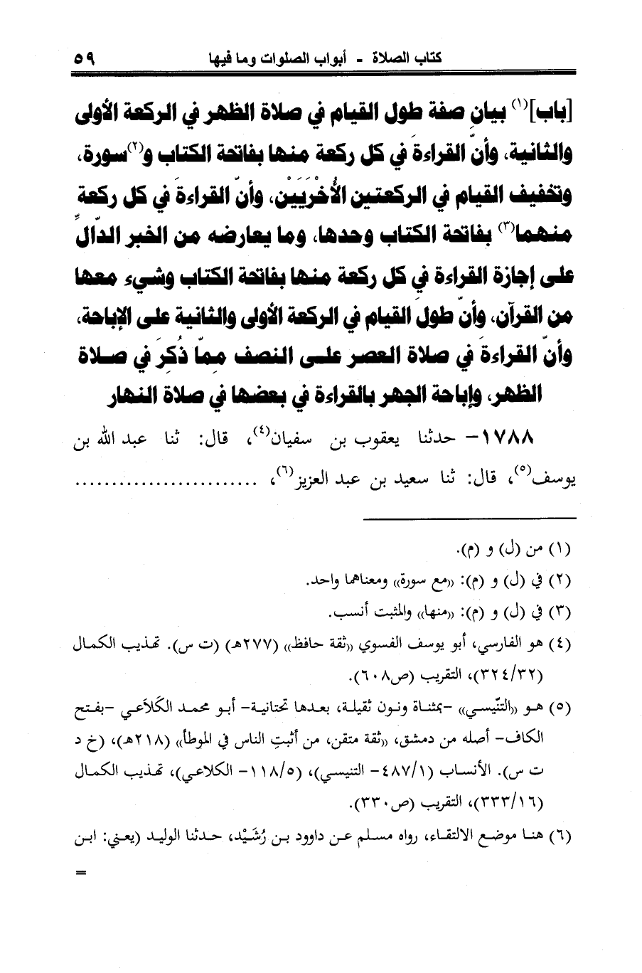 (¬2) هو "التنّيسي" -بمثناة ونون ثقيلة، بعدها تحتانية- أَبو محمد الكَلاَعي -بفتح الكاف- أصله من دمشق، "ثقة متقن، من أثبتِ الناس في الموطأ" (218 هـ)، (خ د ت س). الأنساب (1/ 487 - التنيسي)، (5/ 118 - الكلاعي)، تهذيب الكمال (16/ 333)، التقريب (ص 330).