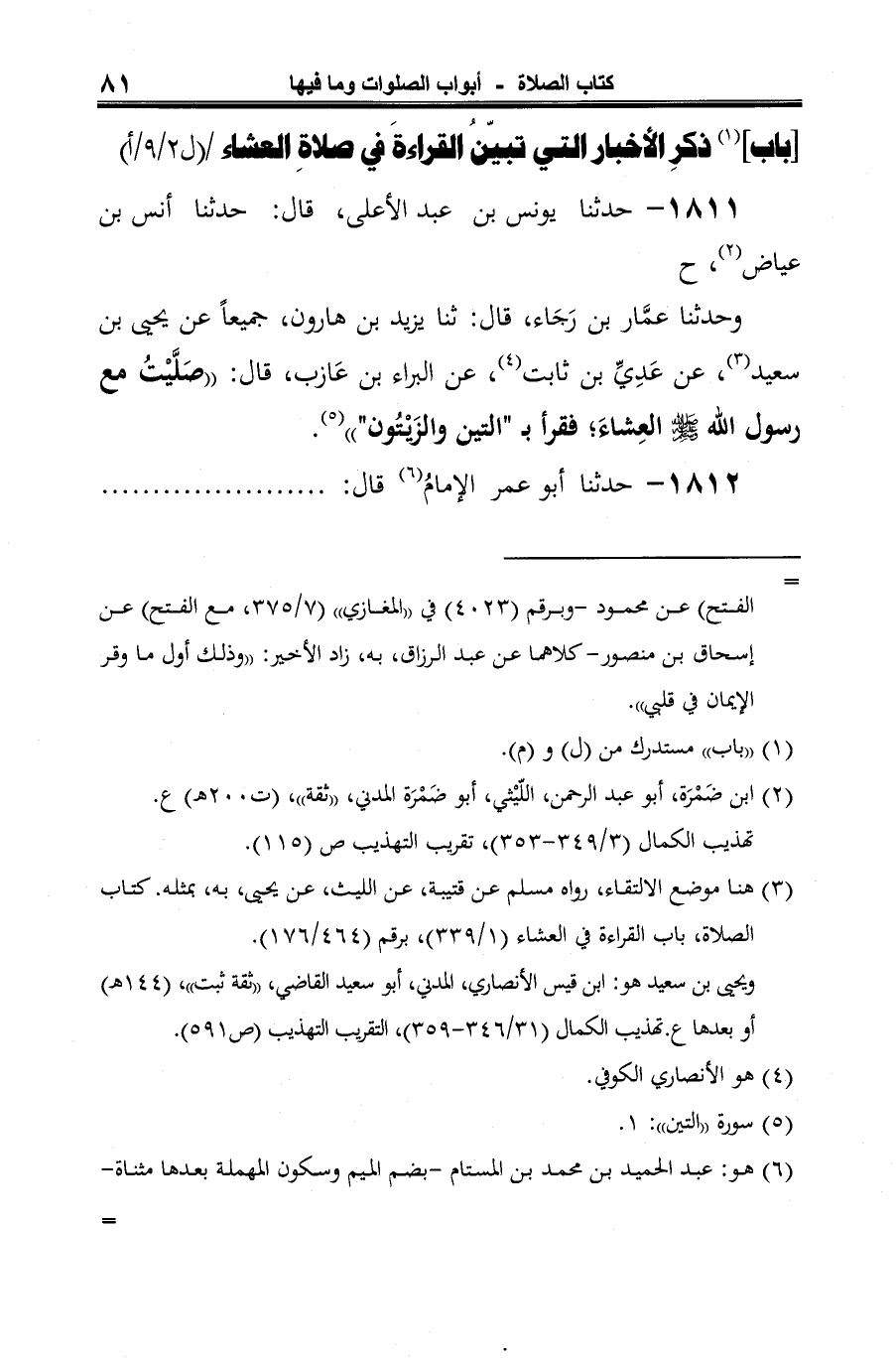 وحدثنا عمَّار بن رَجَاء، قال: تنا يزيد بن هارون، جميعًا عن يحيى بن سعيد (¬2)، عن عَدِيِّ بن ثابت (¬3)، عن البراء بن عَازب، قال: "صَلَّيْتُ مع رسول الله -صلى الله عليه وسلم- العِشاءَ، فقرأ بـ "التين والزَيْتُون"" (¬4).