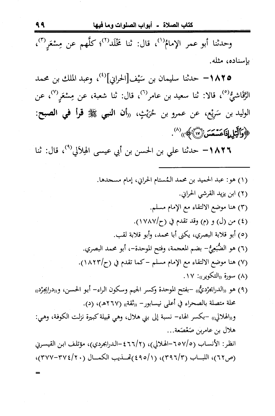 1825 - حدثنا سليمان بن سَيْف [الحراني] (¬1)، وعبد الملك بن محمد الرَّقَاشيُّ (¬2)، قالا: ثنا سعيد بن عامر (¬3)، قال: ثنا شعبة، عن مِسْعَرٍ (¬4)، عن الوليد بن سَرِيْع، عن عمرو بن حُرَيْثٍ، "أن النبي -صلى الله عليه وسلم- قرأ في الصبح: {وَاللَّيْلِ إِذَا عَسْعَسَ} " (¬5).