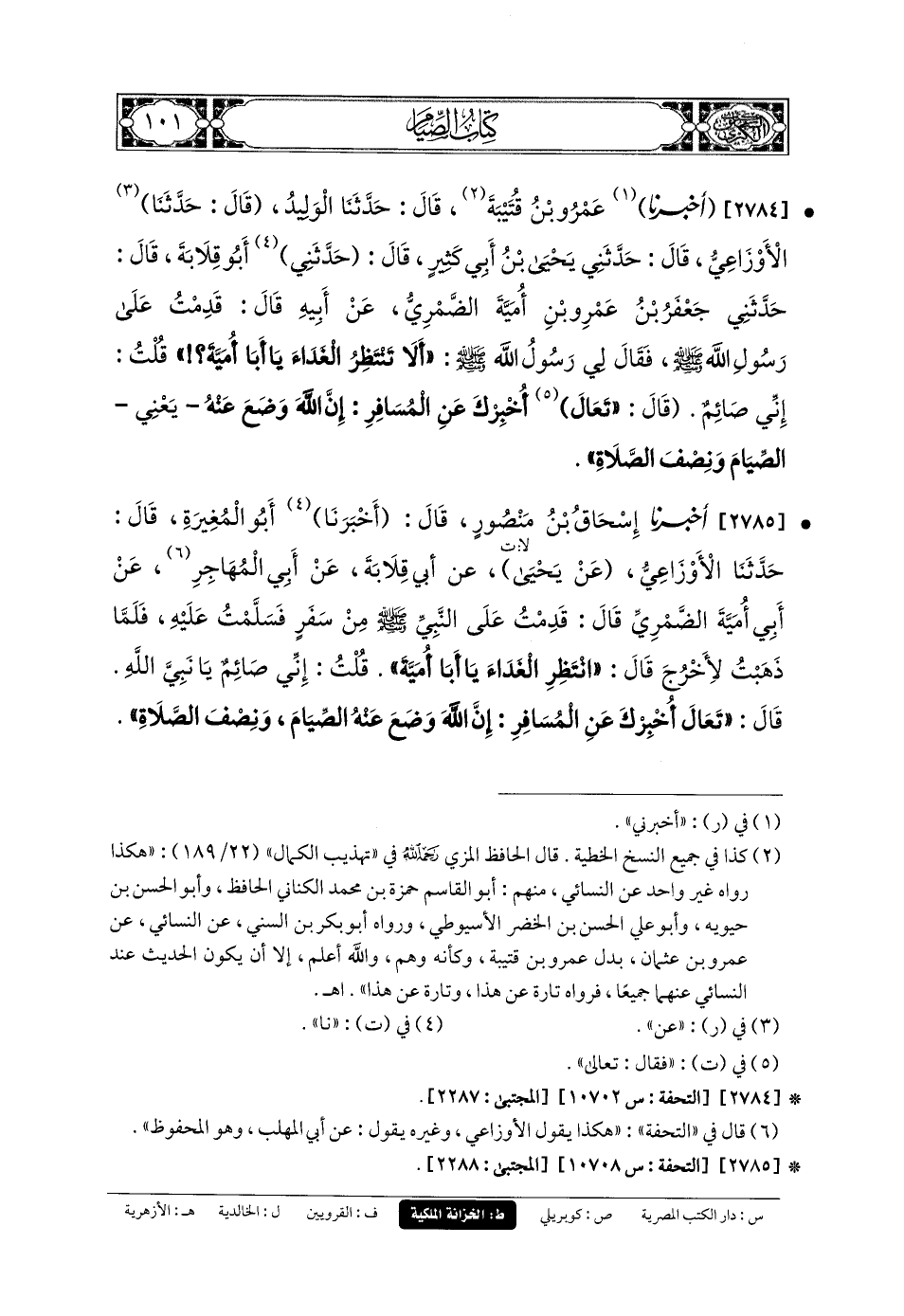 2785- أَخبَرنا إِسحَاقُ بنُ مَنصُورٍ، قَالَ: أَخبَرنا أَبو المُغِيرَةِ، قَالَ: حَدثنا الأَوْزَاعِيُّ، عَن يَحيَى، عَن أَبي قِلابَةَ، عَن أَبي المُهَاجِرِ، عَن أَبي أُمَيَّةَ الضَّمْرِيِّ، قَالَ: قَدِمْتُ عَلَى النَّبِيِّ صَلى الله عَليه وسَلم مِنْ سَفَرٍ، فَسَلَّمْتُ عَلَيْهِ، فَلَمَّا ذَهَبْتُ لأَخْرُجَ، قَالَ: انْتَظِرِ الغَدَاءَ يَا أَبَا أُمَيَّةَ، قُلْتُ: إِنِّي صَائِمٌ يَا نَبِيَّ اللهِ، قَالَ: تَعَالَ أُخْبِرْكَ عَنِ المُسَافِرِ، إِنَّ اللهَ وَضَعَ عَنهُ الصِّيَامَ وَنِصْفَ الصَّلاةِ.