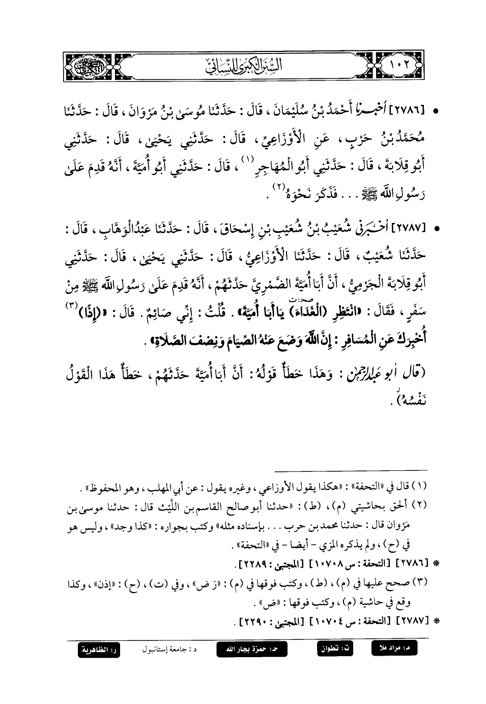 2786- أَخبَرنا أَحْمَدُ بنُ سُلَيمَانَ، قال: حَدثنا مُوسَى بنُ مَرْوَانَ، قَالَ: حَدثنا مُحَمدُ بنُ حَرْبٍ، عَنِ الأَوْزَاعِيِّ، قَالَ: حَدَّثَنِي يَحيَى، قَالَ: حَدَّثَنِي أَبو قِلابَةَ، قَالَ: حَدَّثَنِي أَبو المُهَاجِرِ، قَالَ: حَدَّثَنِي أَبو أُمَيَّةَ، أَنَّهُ قَدِمَ عَلَى رَسُولِ اللهِ صَلى الله عَليه وسَلم، ... فَذَكَرَ نَحْوَهُ.