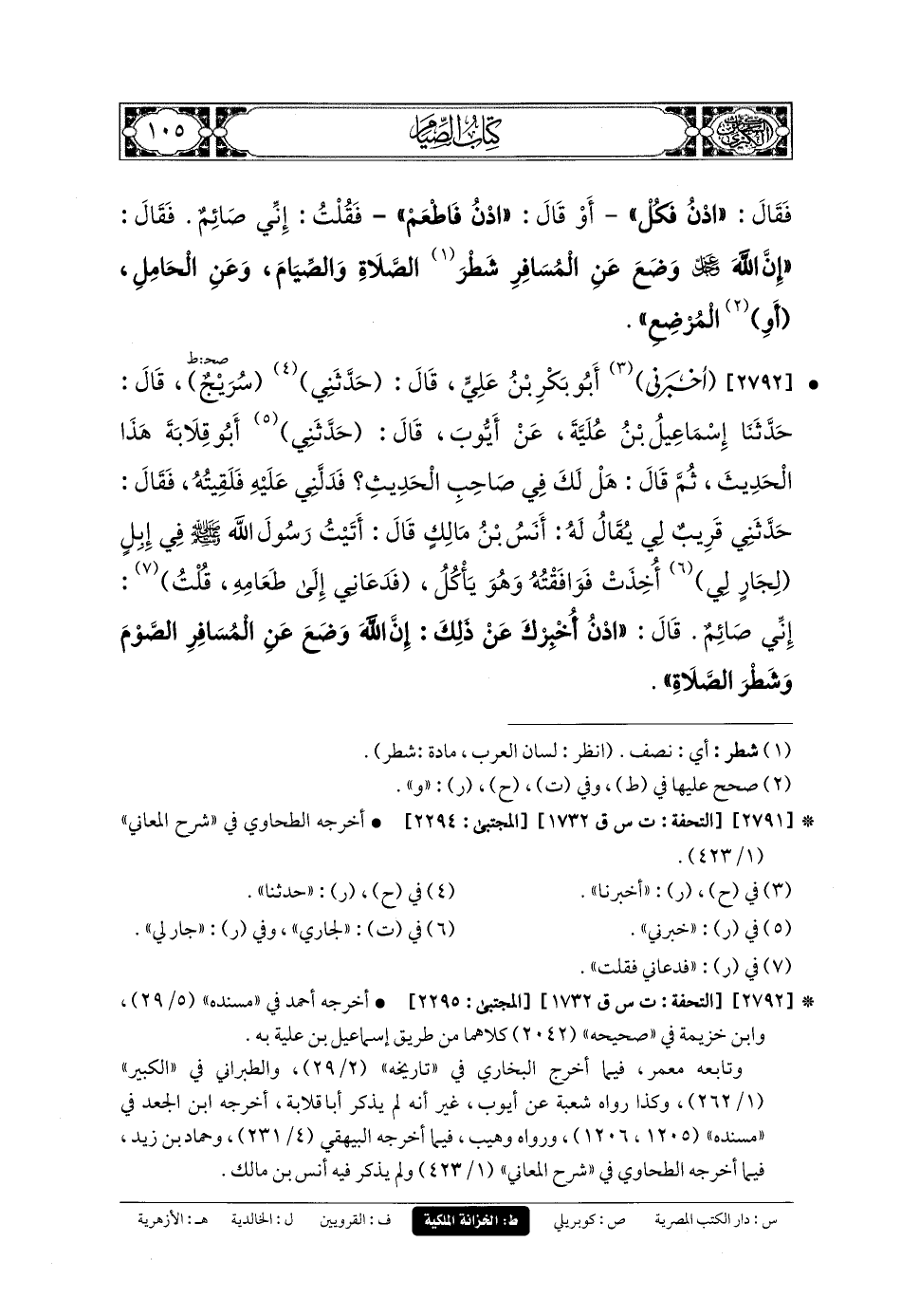 2792- أَخبَرني أَبو بَكْرِ بنُ عَليٍّ، قَالَ: حَدَّثَنِي سُرَيْجٌ، قَالَ: حَدثنا إِسمَاعِيلُ ابنُ عُلَيَّةَ، عَن أَيُّوبَ، قَالَ: حَدَّثَنِي أَبو قِلابَةَ هَذَا الحَدِيثَ، ثُمَّ قَالَ: هَلْ لَكَ فِي صَاحِبِ الحَدِيثِ، فَدَلَّنِي عَلَيْهِ، فَلَقِيتُهُ، فَقَالَ: حَدَّثَنِي قَرِيبٌ لِي يُقَالُ لَهُ: أَنَسُ بنُ مَالِكٍ، قَالَ: أَتَيْتُ رَسُولَ اللهِ صَلى الله عَليه وسَلم فِي إِبِلٍ لِجَارٍ لِي أُخِذَتْ، فَوَافَقْتُهُ وَهُوَ يَأْكُلُ، فَدَعَانِي إِلَى طَعَامِهِ، قُلْتُ: إِنِّي صَائِمٌ، قَالَ: ادْنُ أُخْبِرْكَ عَن ذَلِكَ، إِنَّ اللهَ وَضَعَ عَنِ المُسَافِرِ الصَّوْمَ وَشَطْرَ الصَّلاةِ.
