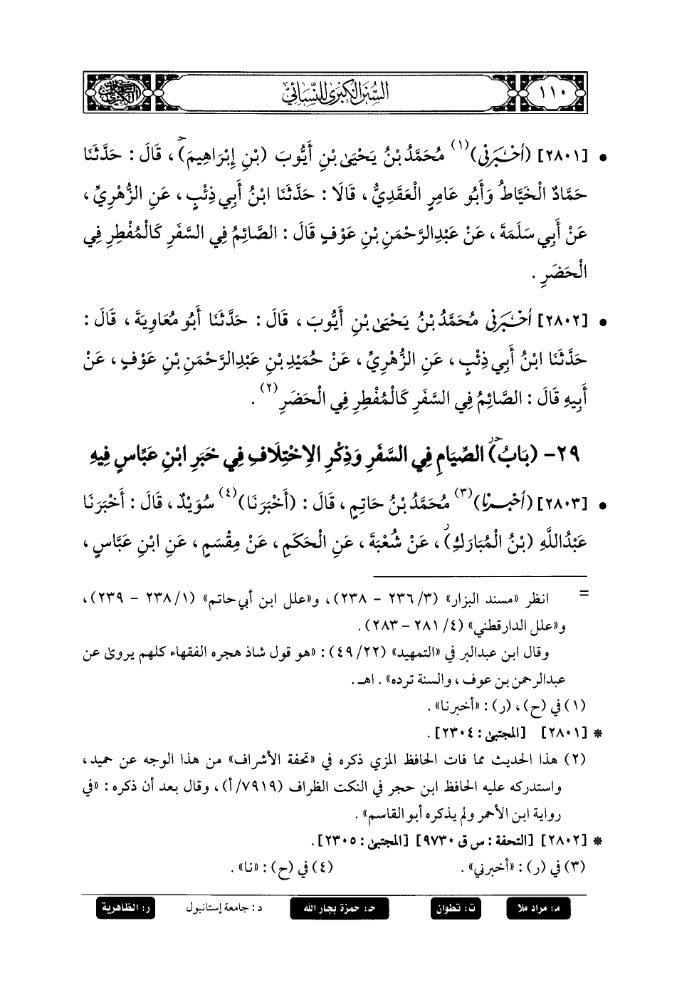 2801- أَخبَرني مُحَمدُ بنُ يَحيَى بنُ أَيُّوبَ بْنِ إِبرَاهِيمَ، قَالَ: حَدثنا حَمَّادٌ الخَيَّاطُ، وَأَبو عَامِرٍ العَقَدِيُّ، قَالا: حَدثنا ابنُ أَبي ذِئْبٍ، عَنِ الزُّهْرِيِّ، عَن أَبي سَلَمَةَ، عَن عَبدِ الرَّحْمَنِ بْنِ عَوْفٍ، قَالَ: الصَّائِمُ فِي السَّفَرِ كَالمُفْطِرِ فِي الحَضَرِ.