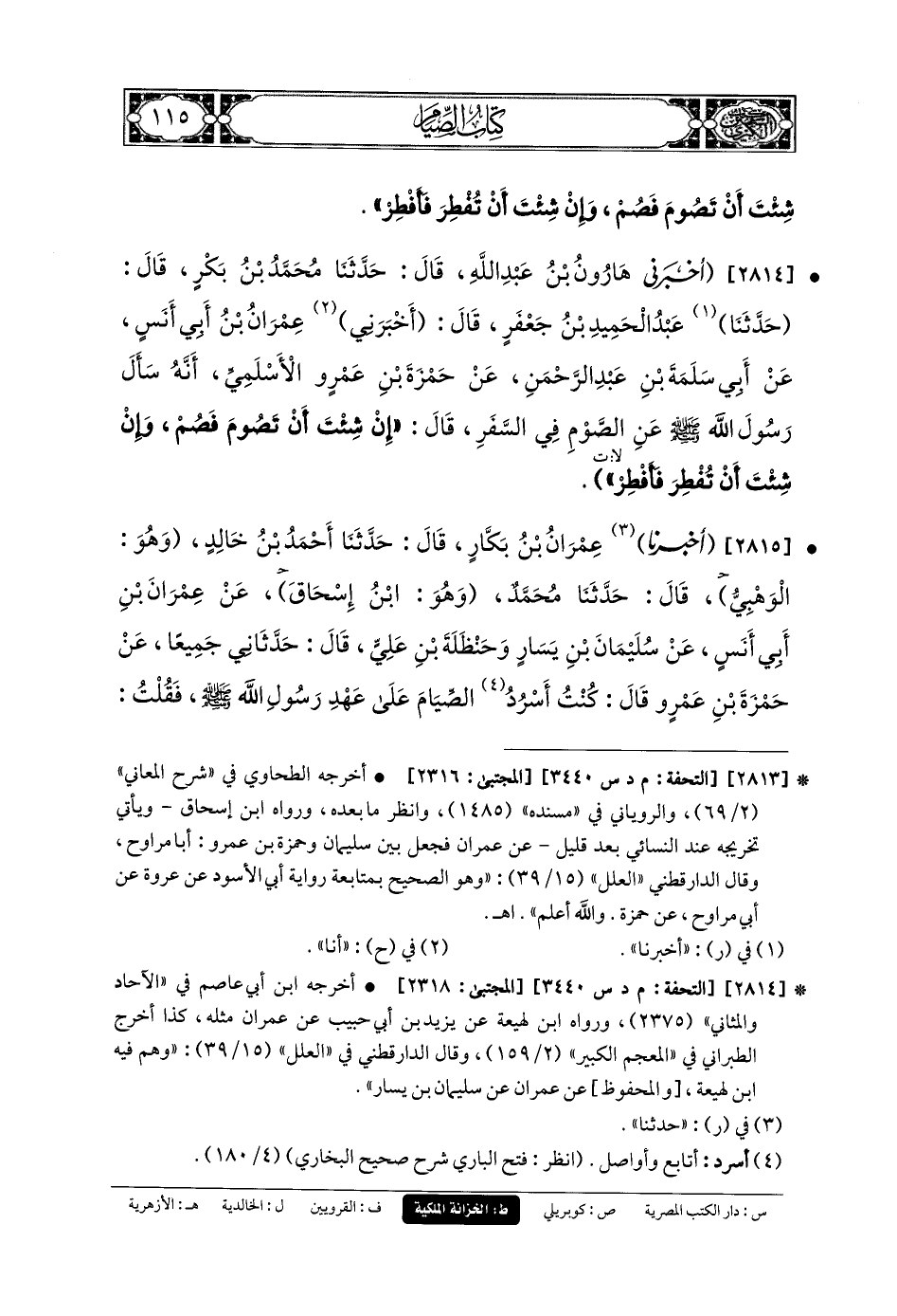 2815- أَخبَرنا عِمْرَانُ بنُ بَكَّارٍ، قَالَ: حَدثنا أَحْمَدُ بنُ خَالِدٍ وَهُوَ الوَهْبِيُّ، قَالَ: حَدثنا مُحَمدٌ وَهُوَ إِسْحَاقَ، عَن عِمْرَانَ بْنِ أَبي أَنَسٍ، عَن سُلَيمَانَ بْنِ يَسَارٍ، وَحَنْظَلَةَ بْنِ عَليٍّ، قَالَ: حَدَّثَانِي جَمِيعًا، عَن حَمْزَةَ بْنِ عَمْرٍو، قَالَ: كُنْتُ أَسْرُدُ الصِّيَامَ عَلَى عَهْدِ رَسُولِ اللهِ صَلى الله عَليه وسَلم، فَقُلْتُ: يَا رَسُولَ اللهِ، إِنِّي أَسْرُدُ الصِّيَامَ أَفَأَصُومُ فِي السَّفَرِ؟ فَقَالَ: إِنْ شِئْتَ فَصُمْ، وَإِنْ شِئْتَ فَأَفْطِرْ.