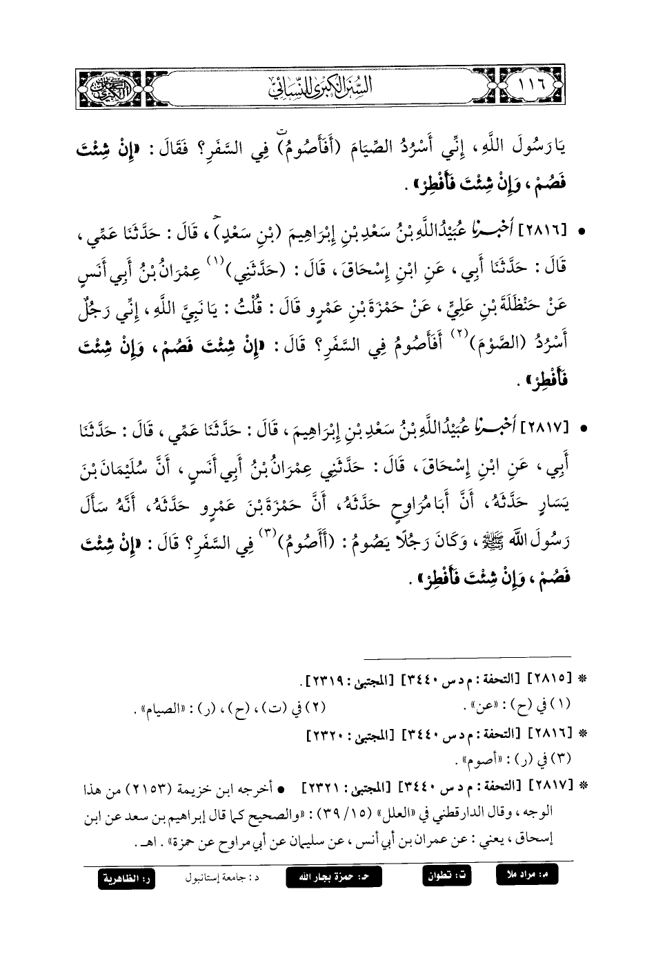 2817- أَخبَرنا عُبَيدُ اللهِ بنُ سَعْدِ بْنِ إِبرَاهِيمَ، قَالَ: حَدثنا عَمِّي، قَالَ: حَدثنا أَبي، عَنِ ابنِ إِسحَاقَ، قَالَ: حَدَّثَنِي عِمْرَانُ بنُ أَبي أَنَسٍ، أَنَّ سُلَيمَانَ بْنَ يَسَارٍ حَدَّثَهُ، أَنَّ أَبَا مُرَاوِحٍ حَدَّثَهُ، أَنَّ حَمْزَةَ بْنَ عَمْرٍو حَدَّثَهُ، أَنَّهُ سَأَلَ رَسُولَ اللهِ صَلى الله عَليه وسَلم وَكَانَ رَجُلاً يَصُومُ، أَأَصُومُ فِي السَّفَرِ؟ قَالَ: إِنْ شِئْتَ فَصُمْ، وَإِنْ شِئْتَ فَأَفْطِرْ.