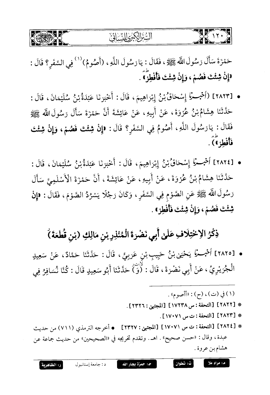 2824- أَخبَرنا إِسحَاقُ بنُ إِبرَاهِيمَ، قَالَ: أَخبَرنا عَبدَةُ بنُ سُلَيمَانَ، قَالَ: حَدثنا هِشَامُ بنُ عُرْوَةَ، عَن أَبيهِ، عَن عَائِشَةَ، أَنَّ حَمْزَةَ الأَسْلَمِيِّ سَأَلَ رَسُولَ اللهِ صَلى الله عَليه وسَلم عَنِ الصَّوْمِ فِي السَّفَرِ، وَكَانَ رَجُلاً يَسْرِدُ الصَّوْمَ، فَقَالَ: إِنْ شِئْتَ فَصُمْ، وَإِنْ شِئْتَ فَأَفْطِرْ.