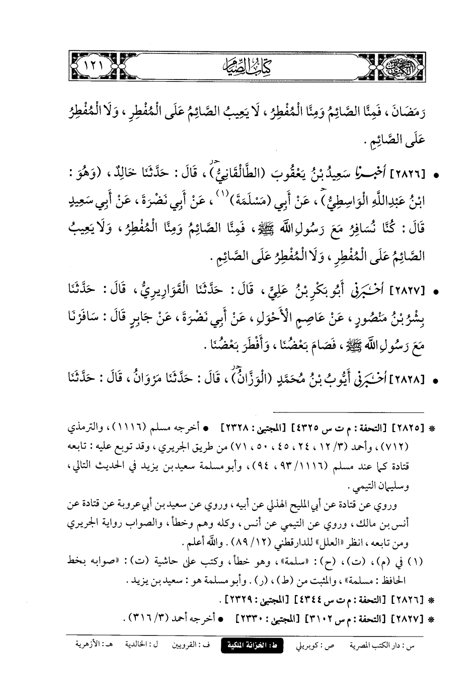 2826- أَخبَرنا سَعِيدُ بنُ يَعقُوبَ الطَّالقَانيُّ، قَالَ: حَدثنا خَالِدٌ ، وَهُوَ ابنُ عَبدِ اللهِ الوَاسِطِيُّ، عَن أَبي مَسْلَمَةَ، عَن أَبي نَضْرَةَ، عَن أَبي سَعِيدٍ، قَالَ: كُنَّا نُسَافِرُ مَعَ رَسُولِ اللهِ صَلى الله عَليه وسَلم، فَمِنَّا الصَّائِمُ وَمِنَّا المُفْطِرُ، وَلا يَعِيبُ الصَّائِمُ عَلَى المُفْطِرِ، وَلا المُفْطِرُ عَلَى الصَّائِمِ.
