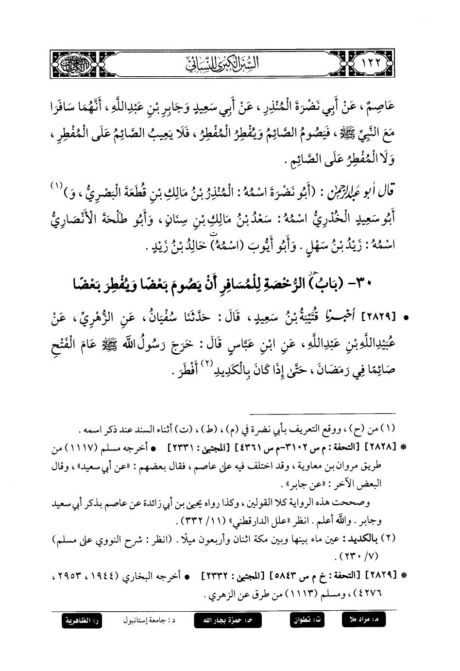 2829- أَخبَرنا قُتَيبَةُ بنُ سَعِيدٍ، قَالَ: حَدثنا سُفْيَانُ، عَنِ الزُّهْرِيِّ، عَن عُبَيدِ اللهِ بْنِ عَبدِ اللهِ، عَنِ ابنِ عَبَّاسٍ، قَالَ: خَرَجَ رَسُولُ اللهِ صَلى الله عَليه وسَلم عَامَ الفَتْحِ صَائِمًا فِي رَمَضَانَ، حَتَّى إِذَا كَانَ بِالكَدِيدِ أَفْطَرَ.
