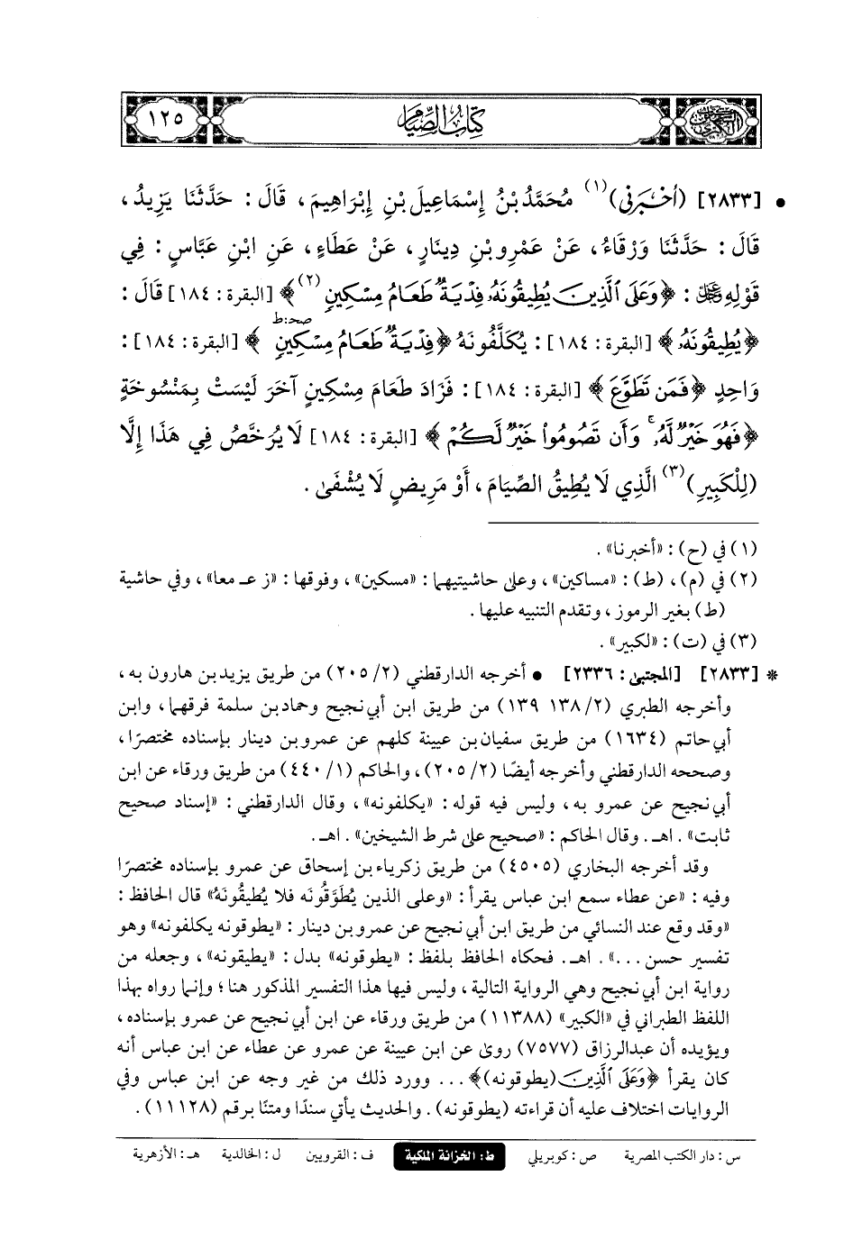 2833- أَخبَرني مُحَمدُ بنُ إِسمَاعِيلَ بْنِ إِبرَاهِيمَ، قَالَ: حَدثنا يَزِيدُ، قَالَ: حَدثنا وَرْقَاءُ، عَن عَمْرِو بْنِ دِينَارٍ، عَن عَطَاءٍ، عَنِ ابنِ عَبَّاسٍ، فِي قَوْلِهِ عَزَّ وَجَلَّ: {وَعَلَى الَّذِينَ يُطِيقُونَهُ فِدْيَةٌ طَعَامُ مِسْكِينٍ} قَالَ: {يُطِيقُونَهُ} يُكَلَّفُونَهُ، فِدْيَةٌ طَعَامُ مِسْكِينٍ وَاحِدٍ، {فَمَنْ تَطَوَّعَ} فَزَادَ طَعَامَ مِسْكِينٍ آخَرَ، لَيْسَتْ بِمَنْسُوخَةٍ {فَهُوَ خَيْرٌ لَهُ وَأَنْ تَصُومُوا خَيْرٌ لَكُمْ}، لا يُرَخَّصُ فِي هَذَا إِلاَّ لِلْكَبِيرِ الَّذِي لا يُطِيقُ الصِّيَامَ، أَوْ مَرِيضٍ لا يُشْفَى.