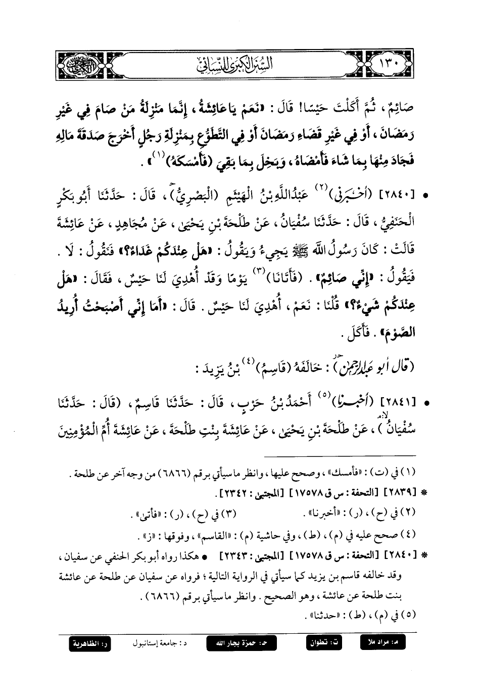 2840- أَخبَرني عَبدُ اللهِ بنُ الهَيْثَمِ البَصْرِيُّ، قَالَ: حَدثنا أَبو بَكْرٍ الحَنَفِيُّ، قَالَ: حَدثنا سُفْيَانُ، عَن طَلحَةَ بْنِ يَحيَى، عَن مُجَاهِدٍ، عَن عَائِشَةَ، قَالَتْ: كَانَ رَسُولُ اللهِ صَلى الله عَليه وسَلم يَجِيءُ وَيَقُولُ: هَلْ عِنْدَكُمْ غَدَاءٌ؟ فَنَقُولُ: لا، فَيَقُولُ: إِنِّي صَائِمٌ، فَأَتَانَا يَوْمًا وَقَدْ أُهْدِيَ لَنَا حَيْسٌ، فَقَالَ: هَلْ عِنْدَكُمْ شَيْءٌ؟ قُلْنَا: نَعَمْ أُهْدِيَ لَنَا حَيْسٌ، قَالَ: أَمَا إِنِّي أَصْبَحْتُ أُرِيدُ الصَّوْمَ، فَأَكَلَ.