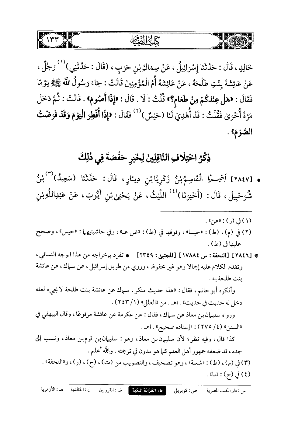 2847- أَخبَرنا القَاسِمُ بنُ زَكَرِيَّا بْنِ دِينَارٍ، قَالَ: حَدثنا سَعِيدُ بنُ شُرَحْبِيلَ، قَالَ: أَخبَرنا اللَّيْثُ، عَن يَحيَى بْنِ أَيُّوبَ، عَن عَبدِ اللهِ بْنِ أَبي بَكْرٍ، عَن سَالِمِ بْنِ عَبدِ اللهِ، عَن عَبدِ اللهِ بْنِ عُمَرَ، عَن حَفْصَةَ، عَن رَسُولِ اللهِ صَلى الله عَليه وسَلم قَالَ: مَنْ لَمْ يُبَيِّتِ الصِّيَامَ قَبْلَ الفَجْرِ فَلا صِيَامَ لَهُ.