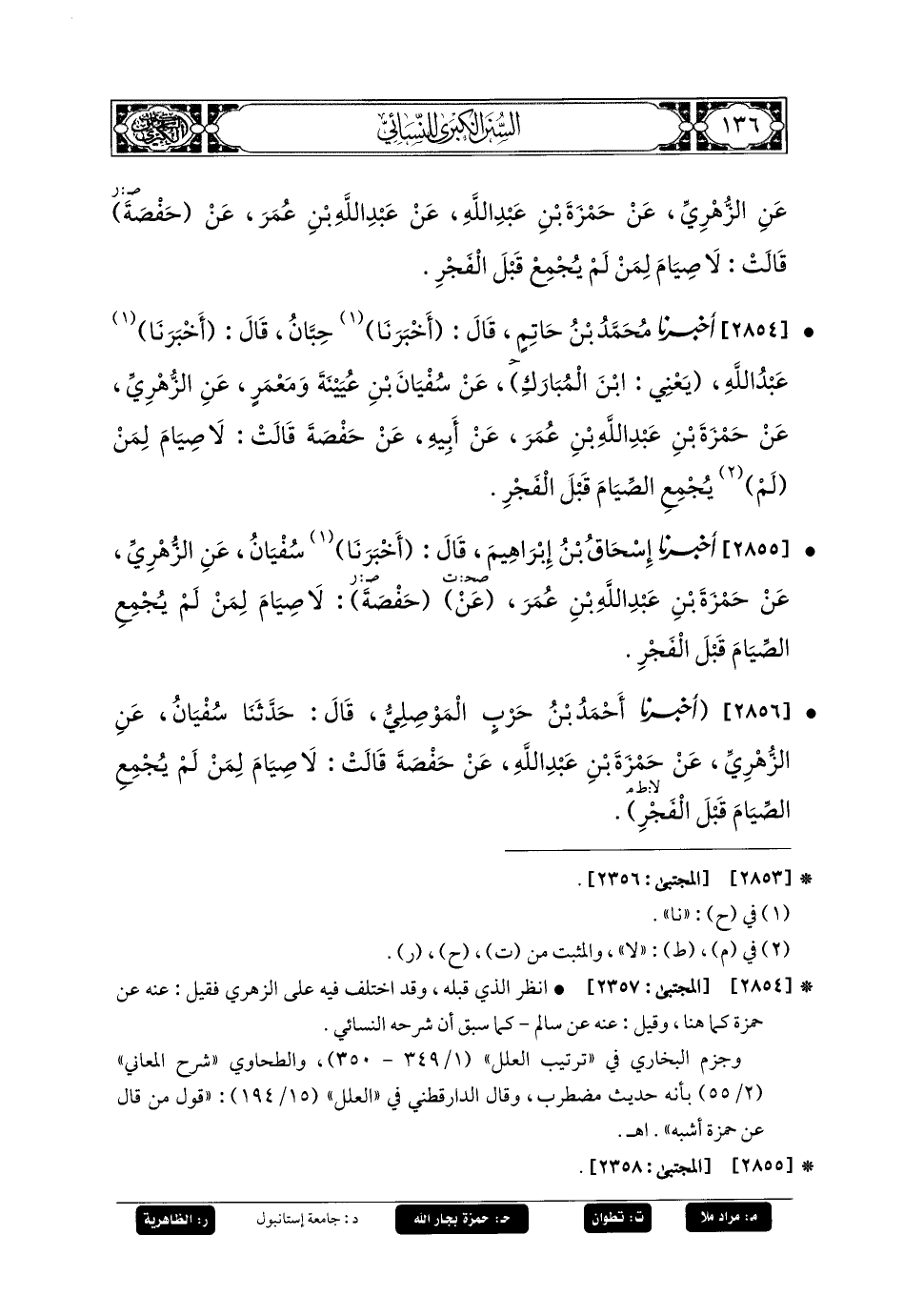 2856- أَخبَرنا أَحْمَدُ بنُ حَرْبٍ المَوْصليُّ، قَالَ: حَدثنا سُفْيَانُ، عَنِ الزُّهْرِيِّ، عَن حَمْزَةَ بْنِ عَبدِ اللهِ، عَن حَفْصَةَ قَالَتْ: لا صِيَامَ لِمَنْ لَمْ يُجْمِعِ الصِّيامَ قَبْلَ الفَجْرِ.