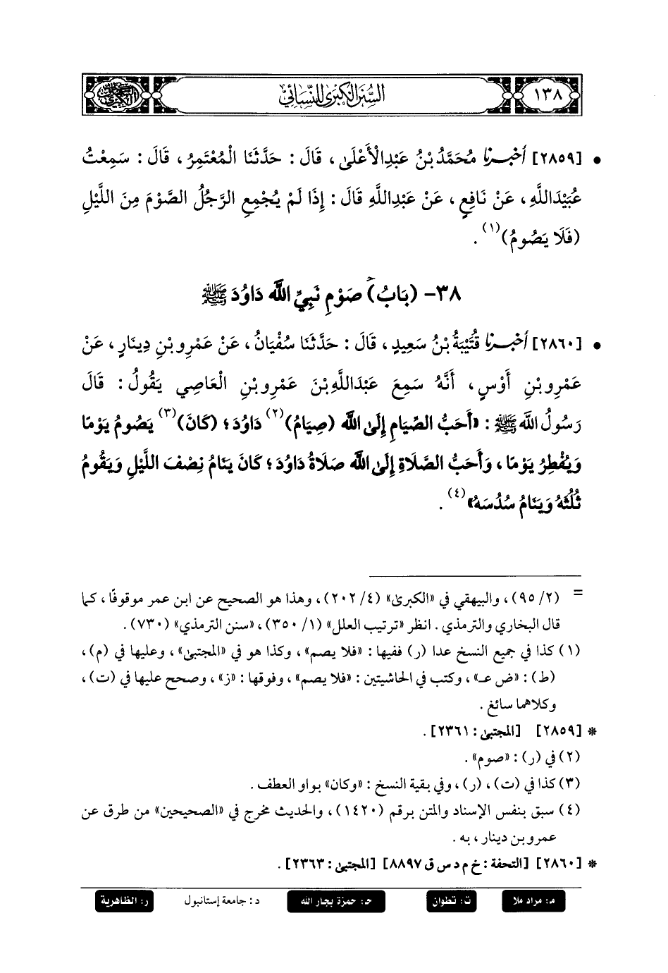 2860- أَخبَرنا قُتَيبَةُ بنُ سَعِيدٍ، قَالَ: حَدثنا سُفْيَانُ، عَن عَمْرِو بْنِ دِينَارٍ، عَن عَمْرِو بْنِ أَوْسٍ، أَنَّهُ سَمِعَ عَبدَ اللهِ بْنَ عَمْرِو بْنِ العَاصِ، يَقُولُ: قَالَ رَسُولُ اللهِ صَلى الله عَليه وسَلم: أَحَبُّ الصِّيَامِ إِلَى اللهِ صِيَامُ دَاوُدَ، كَانَ يَصُومُ يَوْمًا وَيُفْطِرُ يَوْمًا، وَأَحَبُّ الصَّلاةِ إِلَى اللهِ صَلاةُ دَاوُدَ، كَانَ يَنَامُ نِصْفَ اللَّيْلِ، وَيَقُومُ ثُلُثَهُ، وَيَنَامُ سُدُسَهُ.