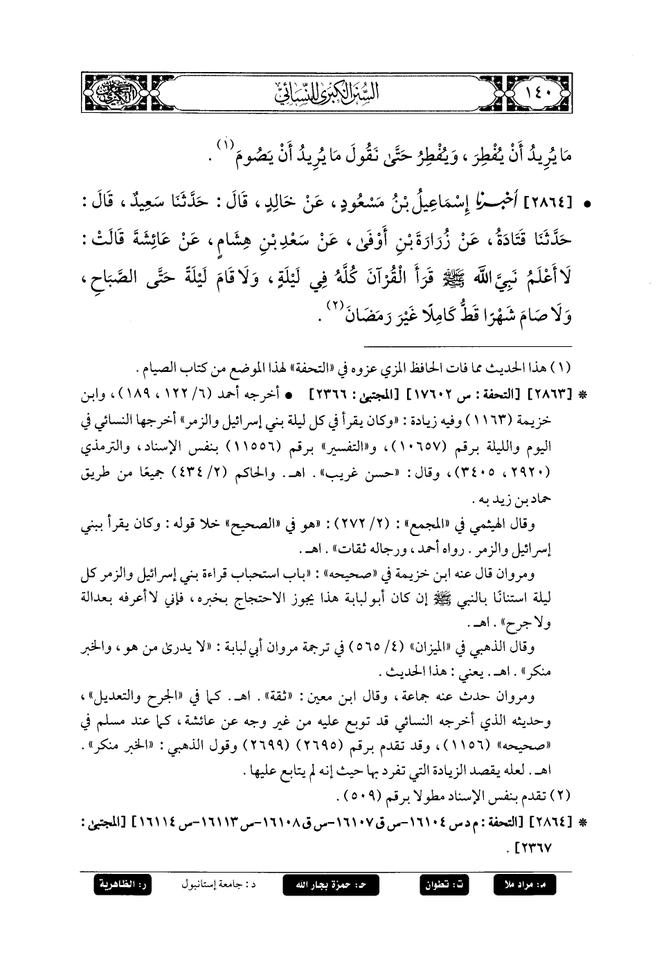 2864- أَخبَرنا إِسمَاعِيلُ بنُ مَسْعُودٍ، عَن خَالِدٍ، قَالَ: حَدثنا سَعِيدٌ، قَالَ: حَدثنا قَتَادَةُ، عَن زُرَارَةَ بْنِ أَوْفَى، عَن سَعْدِ بْنِ هِشَامٍ، عَن عَائِشَةَ، قَالَتْ: لا أَعْلَمُ نَبِيَّ اللهِ صَلى الله عَليه وسَلم قَرَأَ القُرْآنَ كُلَّهُ فِي لَيْلَةٍ، وَلا قَامَ لَيْلَةً حَتَّى الصَّبَّاحِ، وَلا صَامَ شَهْرًا قَطُّ كَامِلاً غَيْرَ رَمَضَانَ.