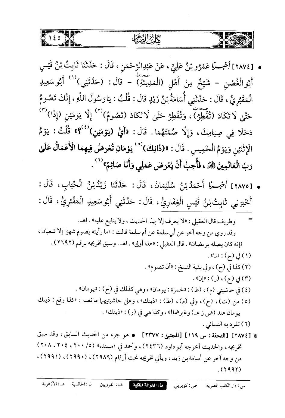 2874- أَخبَرنا عَمرُو بنُ عَليٍّ، عَن عَبدِ الرَّحْمَنِ، قَالَ: حَدثنا ثَابِتُ بنُ قَيسٍ أَبو الغُصْنِ، شَيْخٌ مِنْ أَهْلِ المَدِينَةِ، حَدَّثَنِي أَبو سَعِيدٍ المَقْبُرِيُّ، قَالَ: حَدَّثَنِي أُسَامَةُ بنُ زَيْدٍ، قَالَ: قُلْتُ: يَا رَسُولَ اللهِ، إِنَّكَ تَصُومُ حَتَّى لا تَكَادُ تُفْطِرُ، وَتُفْطِرُ حَتَّى لا تَكَادُ أَنْ تَصُومَ إِلاَّ يَوْمَيْنِ إِذَا دَخَلا فِي صِيَامِكَ وَإِلاَّ صُمْتَهُمَا، قَالَ: أَيُّ يَوْمَيْنِ؟ قُلْتُ: يَوْمُ الاِثْنَيْنِ، وَيَوْمُ الخَمِيسِ، قَالَ: ذَانِكَ يَوْمَانِ تُعْرَضُ فِيهِمَا الأَعْمَالُ عَلَى رَبِّ العَالَمِينَ، فَأُحِبُّ أَنْ يُعْرَضَ عَمَلِي وَأَنَا صَائِمٌ.