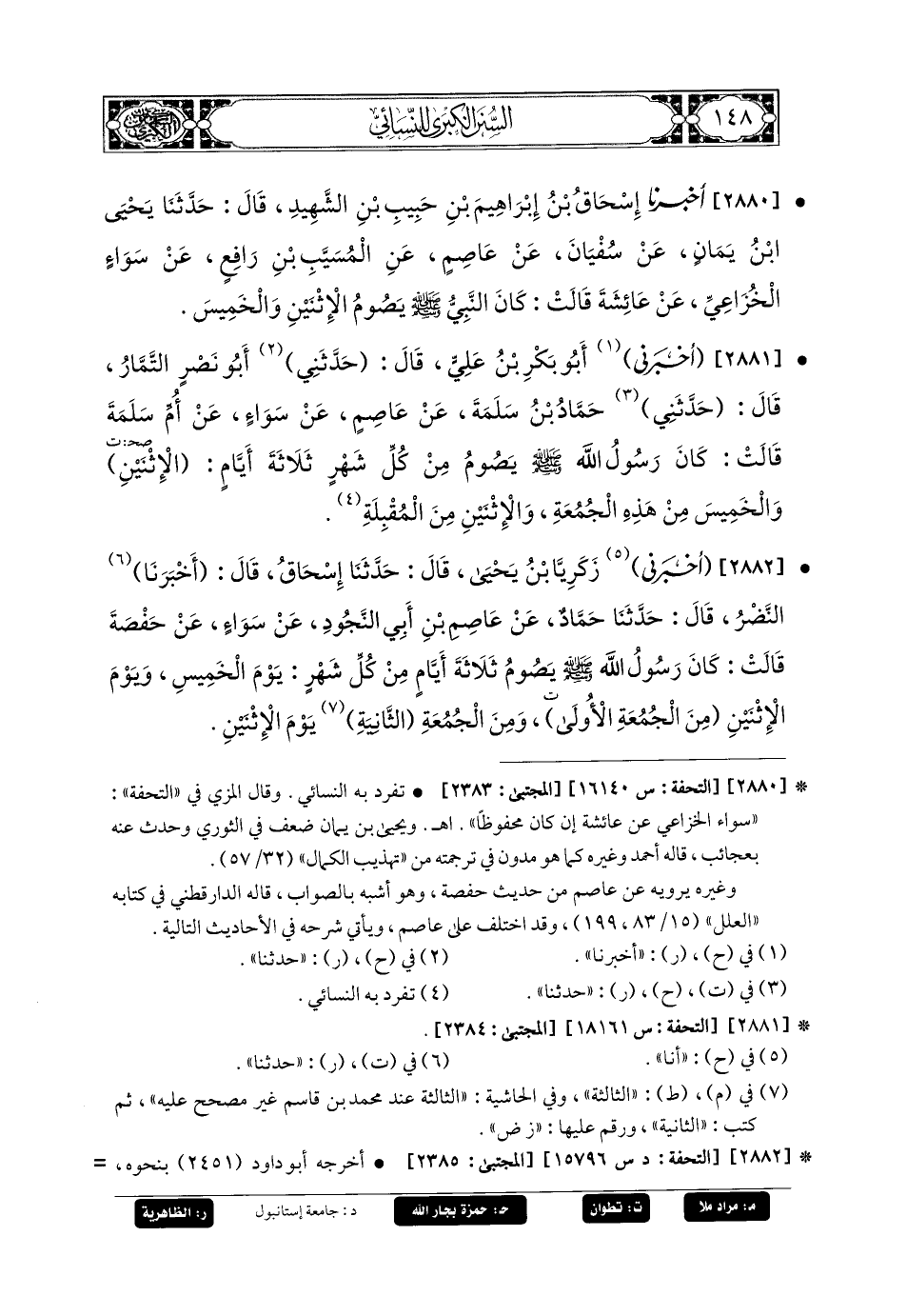 2881- أَخبَرني أَبو بَكْرِ بنُ عَليٍّ، قَالَ: حَدَّثَنِي أَبو نَصْرٍ التَّمَّارُ، قَالَ: حَدَّثَنِي حَمَّادُ بنُ سَلَمَةَ، عَن عَاصِمٍ، عَن سَوَاءٍ، عَن أُمِّ سَلَمَةَ، قَالَتْ: كَانَ رَسُولُ اللهِ صَلى الله عَليه وسَلم يَصُومُ مِنْ كُلِّ شَهْرٍ ثَلاثَةَ أَيَّامٍ: الاِثْنَيْنِ وَالخَمِيسَ مِنْ هَذِهِ الجُمُعَةِ، وَالاِثْنَيْنِ مِنَ المُقْبِلَةِ.
