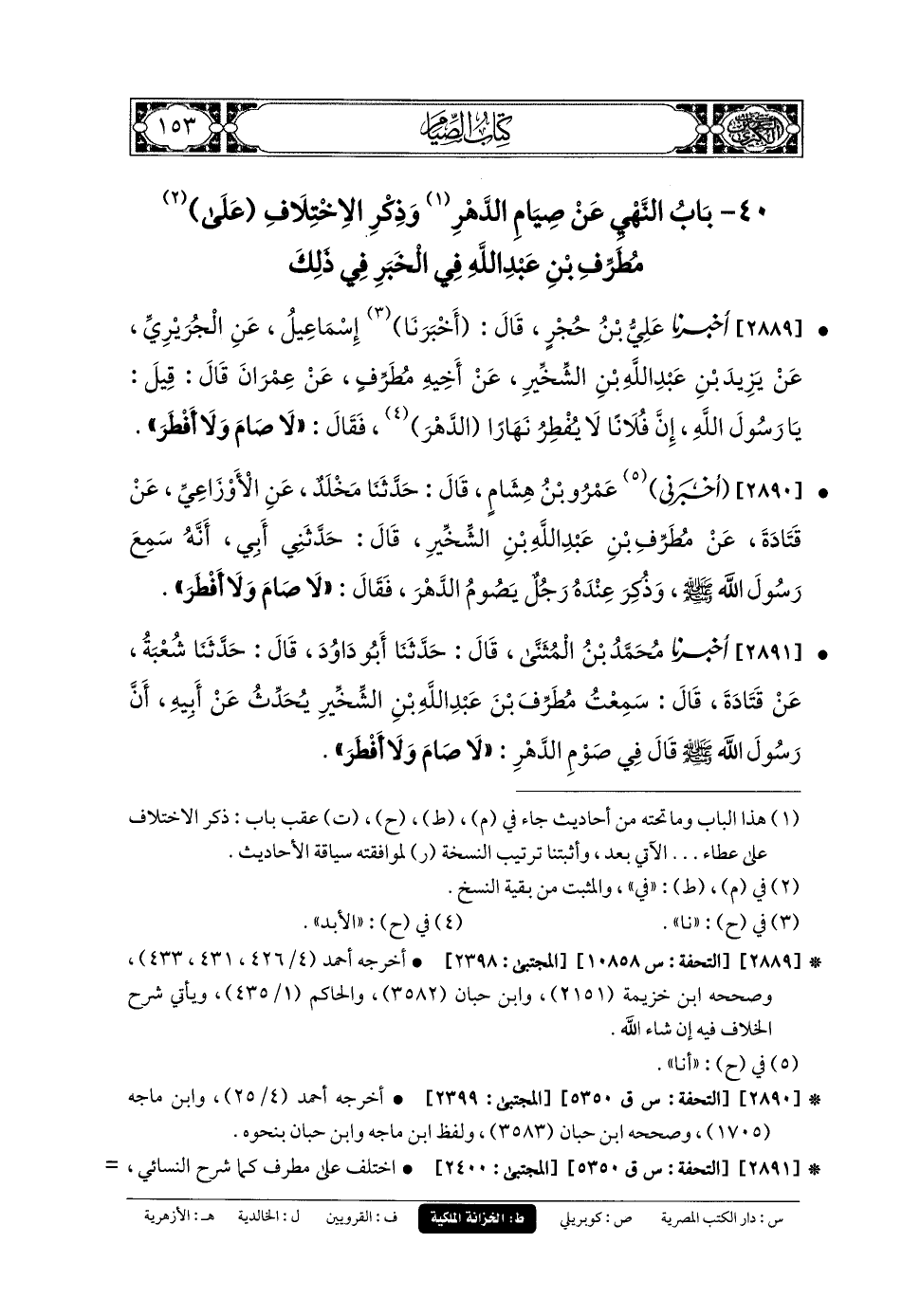 40- بَابُ النَّهْيِ عَن صِيَامِ الدَّهْرِ وَذِكْرُ الاِخْتِلافِ عَلَى مُطَرِّفِ بْنِ عَبدِ اللهِ فِي الخَبَرِ فِي ذَلِكَ.