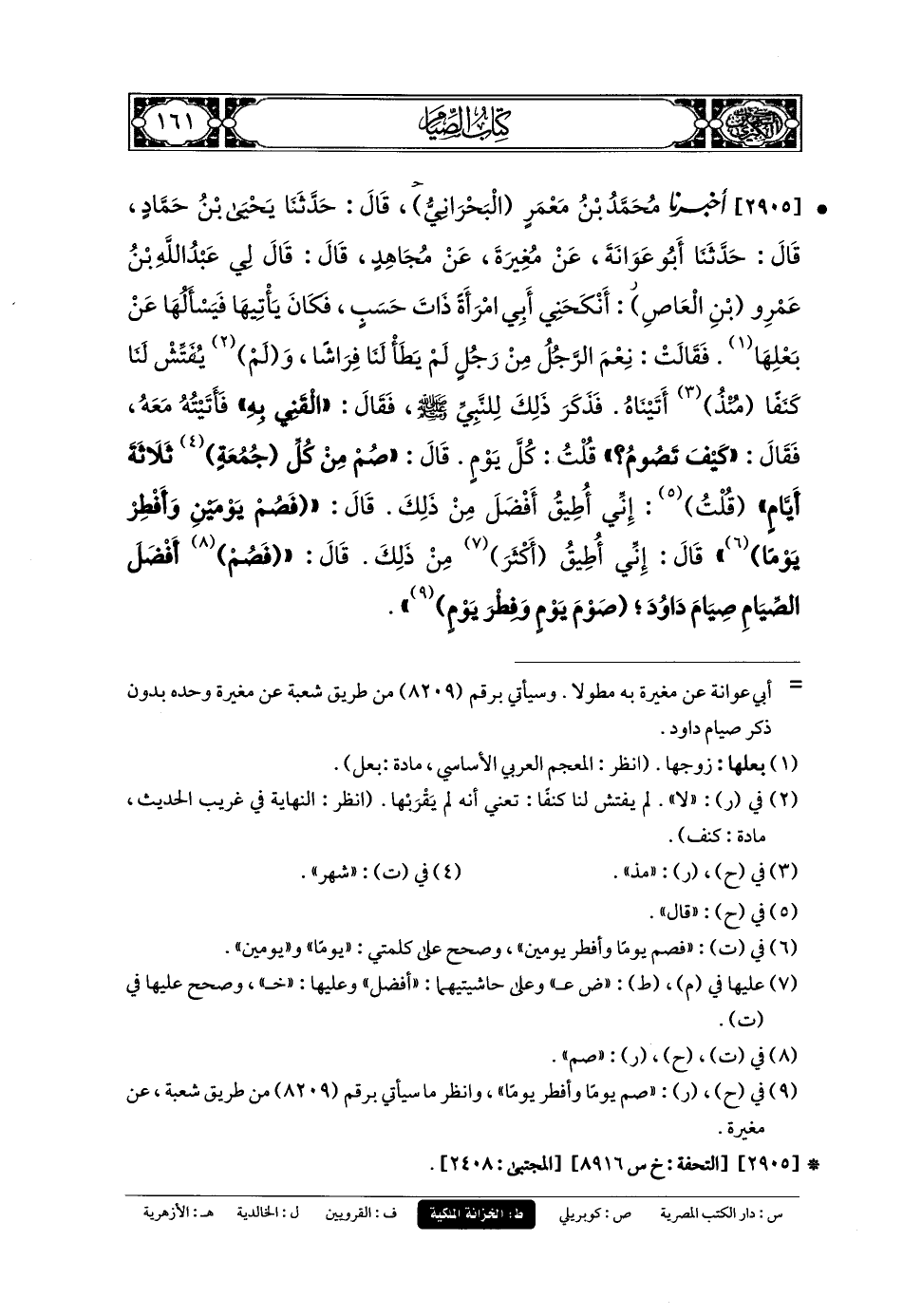 2905- أَخبَرنا مُحَمدُ بنُ مَعْمَرٍ البَحْرَانِيُّ، قَالَ: حَدثنا يَحيَى بنُ حَمَّادٍ، قَالَ: حَدثنا أَبو عَوَانَةَ، عَن مُغِيرَةَ، عَن مُجَاهِدٍ، قَالَ: قَالَ لِي عَبدُ اللهِ بنُ عَمْرٍو بْنِ العَاصِ: أَنْكَحَنِي أَبي امْرَأَةً ذَاتَ حَسَبٍ، فَكَانَ يَأْتِيهَا فَيَسْأَلُهَا عَن بَعْلِهَا، فَقَالَتْ: نِعْمَ الرَّجُلُ مِنْ رَجُلٍ، لَمْ يَطَأْ لَنَا فِرَاشًا، وَلَمْ يُفَتِّشْ لَنَا كَنَفًا مُنْذُ أَتَيْنَاهُ، فَذَكَرَ ذَلِكَ لِلنَّبِيِّ صَلى الله عَليه وسَلم، فَقَالَ: القَنِي بِهِ، فَأَتَيْتُهُ مَعَهُ، فَقَالَ: كَيْفَ تَصُومُ؟ قُلْتُ: كُلَّ يَوْمٍ، قَالَ: صُمْ مِنْ كُلِّ جُمُعَةٍ ثَلاثَةَ أَيَّامٍ، قُلْتُ: إِنِّي أُطِيقُ أَفْضَلَ مِنْ ذَلِكَ، قَالَ: فَصُمْ يَوْمَيْنِ وَأَفْطِرْ يَوْمًا، قُلْتُ (1): إِنِّي أُطِيقُ أَكْثَرَ مِنْ ذَلِكَ، قَالَ: فَصُمْ أَفْضَلَ الصِّيَامِ، صِيَامَ دَاوُدَ، صَوْمَ يَوْمٍ وَفِطْرَ يَوْمٍ.