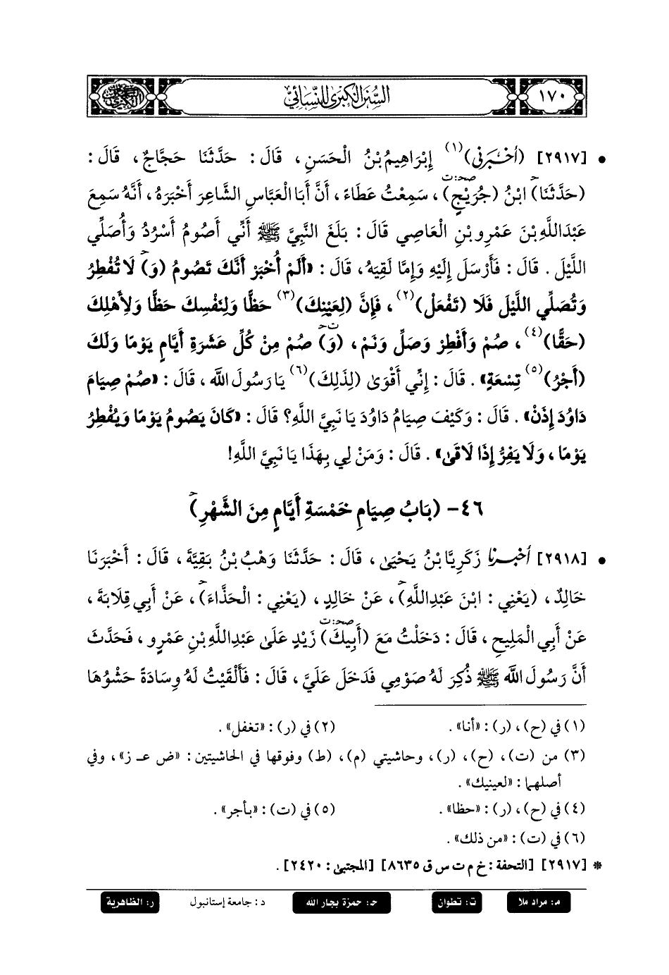 2917- أَخبَرني إِبرَاهِيمُ بنُ الحَسَنِ، قَالَ: حَدثنا حَجَّاجٌ، قَالَ: حَدثنا ابنُ جُرَيْجٍ، سَمِعْتُ عَطَاءً، أَنَّ أَبَا العَبَّاسِ الشَّاعِرَ أَخبَرَهُ، أَنَّهُ سَمِعَ عَبدَ اللهِ بْنَ عَمْرِو بْنِ العَاصِ، قَالَ: بَلَغَ النَّبِيَّ صَلى الله عَليه وسَلم أَنِّي أَصُومُ أَسْرُدُ، وَأُصَلِّي اللَّيْلَ، قَالَ: فَأَرْسَلَ إِلَيْهِ، وَإِمَّا لَقِيَهُ، قَالَ: أَلَمْ أُخْبَرْ أَنَّكَ تَصُومُ وَلا تُفْطِرُ، وَتُصَلِّي اللَّيْلَ؟ فَلا تَفْعَلْ، فَإِنَّ لِعَيْنِكَ حَظًّا، وَلِنَفْسِكَ حَظًّا، وَلأَهْلِكَ حَقًّا، صُمْ وَأَفْطِرْ، وَصَلِّ وَنَمْ، صُمْ مِنْ كُلِّ عَشَرَةِ أَيَّامٍ يَوْمًا وَلَكَ أَجْرُ تِسْعَةٍ، قَالَ: إِنِّي أَقْوَى لِذَلِكَ يَا رَسُولَ اللهِ، قَالَ: صُمْ صِيَامَ دَاوُدَ إِذًا، قَالَ: وَكَيْفَ صِيَامُ دَاوُدَ يَا نَبِيَّ اللهِ؟ قَالَ: كَانَ يَصُومُ يَوْمًا وَيُفْطِرُ يَوْمًا، وَلا يَفِرُّ إِذَا لاقَى، قَالَ: وَمَنْ لِي بِهَذَا يَا نَبِيَّ اللهِ؟.