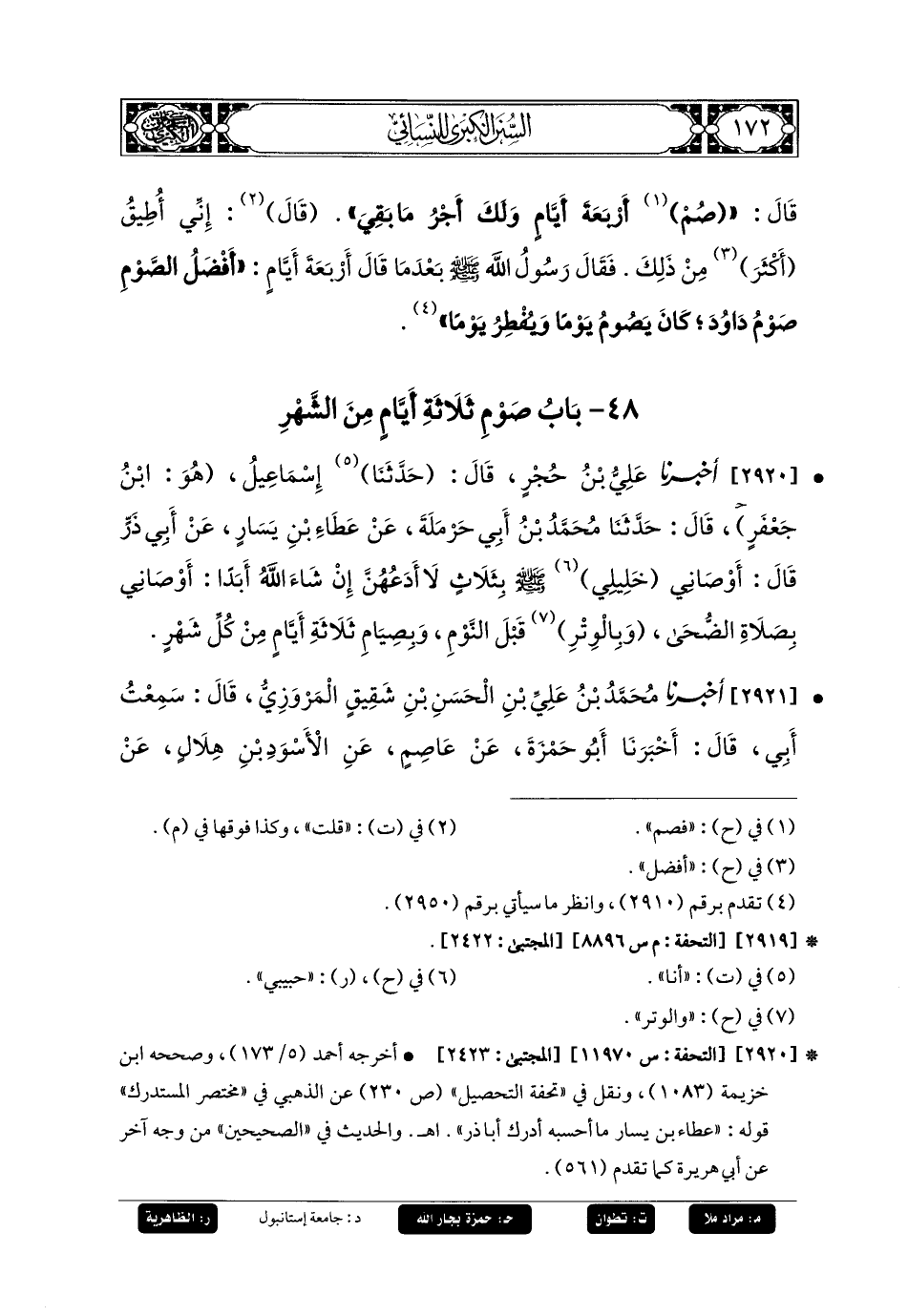 2921- أَخبَرنا مُحَمدُ بنُ عَلَيِّ بْنِ الحَسَنِ بْنِ شَقِيقٍ المَرْوَزِيُّ، قَالَ: سَمِعْتُ أَبي، قَالَ: أَخبَرنا أَبو حَمْزَةَ، عَن عَاصِمٍ، عَنِ الأَسْوَدِ بْنِ هِلالٍ، عَن أَبي هُرَيرَةَ قَالَ: أَمَرَنِي نَبِيُّ اللهِ صَلى الله عَليه وسَلم بِثَلاثٍ: نَوْمٍ عَلَى وِتْرٍ، وَغُسْلٌ يَوْمَ الجُمُعَةِ، وَصِيَامُ ثَلاثَةِ أَيَّامٍ مِنْ كُلِّ شَهْرٍ.