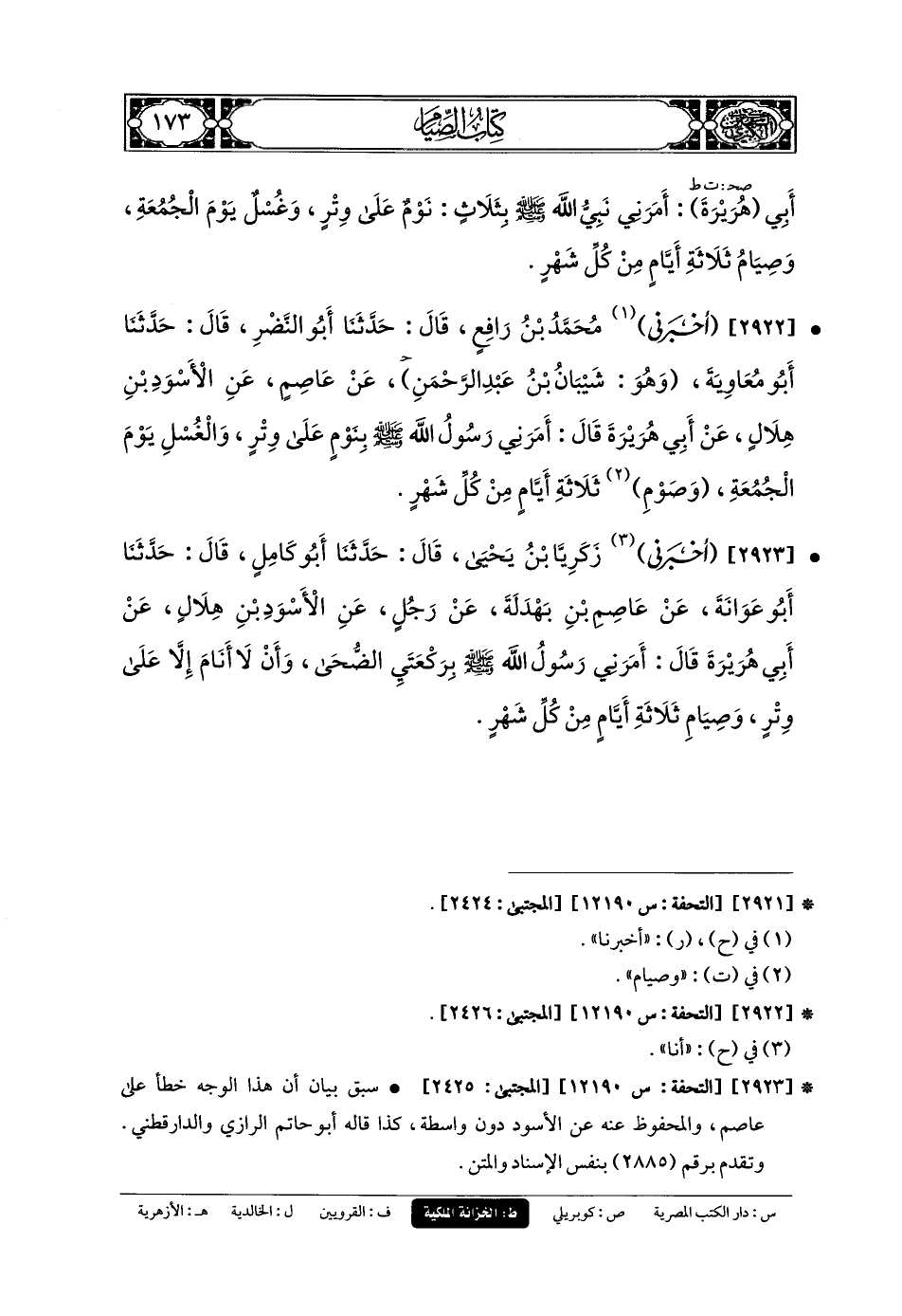 2922- أَخبَرني مُحَمدُ بنُ رَافِعٍ، قَالَ: حَدثنا أَبو النَّضْرِ، قَالَ: حَدثنا أَبو مُعاويَةَ، وَهُوَ شَيْبَانُ بنُ عَبدِ الرَّحْمَنِ، عَن عَاصِمٍ، عَنِ الأَسْوَدِ بْنِ هِلالٍ، عَن أَبي هُرَيرَةَ، قَالَ: أَمَرَنِي رَسُولُ اللهِ صَلى الله عَليه وسَلم بِنَوْمٍ عَلَى وَتْرٍ، وَالغُسْلِ يَوْمَ الجُمُعَةِ، وَصَوْمِ ثَلاثَةِ أَيَّامٍ مِنْ كُلِّ شَهْرٍ.