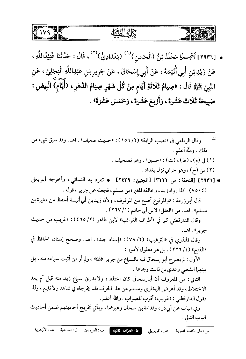 2936- أَخبَرَنَا مَخْلَدُ بنُ الحَسَنِ بَغْدَادِيٌّ، قَالَ: حَدثنا عُبَيدُ اللهِ، عَن زَيْدِ بْنِ أَبي أُنَيْسَةَ، عَن أَبي إِسحَاقَ، عَن جَرِيرِ بْنِ عَبدِ اللهِ البَجَلِيِّ، عَنِ النَّبِيِّ صَلى الله عَليه وسَلم قَالَ: صِيَامُ ثَلاثَةِ أَيَّامٍ مِنْ كُلِّ شَهْرٍ صِيَامُ الدَّهْرِ: أَيَّامُ البِيضِ؛ صَبِيحَةَ ثَلاثَ عَشْرَةَ، وَأَرْبَعَ عَشْرَةَ، وَخَمْسَ عَشْرَةَ.