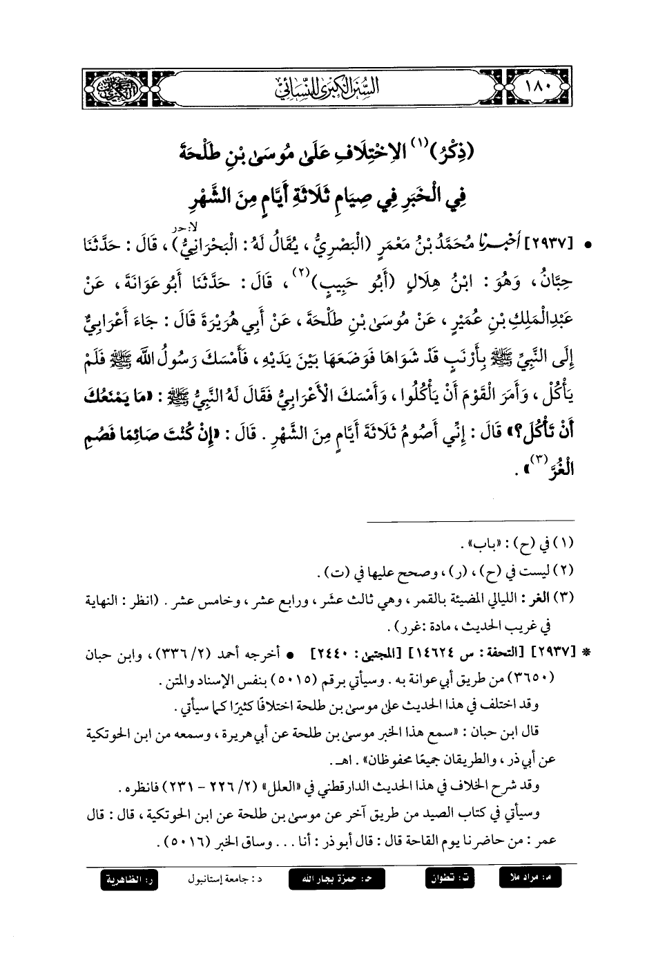 2937- أَخبَرنا مُحَمدُ بنُ مَعْمَرٍ البَصْرِيُّ، يُقَالُ لَهُ: البَحْرَانِيُّ، قَالَ: حَدثنا حَبَّانُ (1)، وَهُوَ ابنُ هِلالٍ أَبو حَبِيبٍ، قَالَ: حَدثنا أَبو عَوَانَةَ، عَن عَبدِ المَلِكِ بْنِ عُمَيْرٍ، عَن مُوسَى بْنِ طَلحَةَ، عَن أَبي هُرَيرَةَ، قَالَ: جَاءَ أَعْرَابِيٌّ إِلَى النَّبِيِّ صَلى الله عَليه وسَلم بِأَرْنَبٍ قَدْ شَوَاهَا، فَوَضَعَهَا بَيْنَ يَدَيْهِ، فَأَمْسَكَ رَسُولُ اللهِ صَلى الله عَليه وسَلم، فَلَمْ يَأْكُلْ، وَأَمَرَ القَوْمَ أَنْ يَأْكُلُوا، وَأَمْسَكَ الأَعْرَابِيُّ، فَقَالَ لَهُ النَّبِيُّ صَلى الله عَليه وسَلم: مَا يَمْنَعُكَ أَنْ تَأْكُلَ؟ قَالَ: إِنِّي أَصُومُ ثَلاثَةَ أَيَّامٍ مِنَ الشَّهْرِ، قَالَ: إِنْ كُنْتَ صَائِمًا فَصُمِ الغُرَّ.