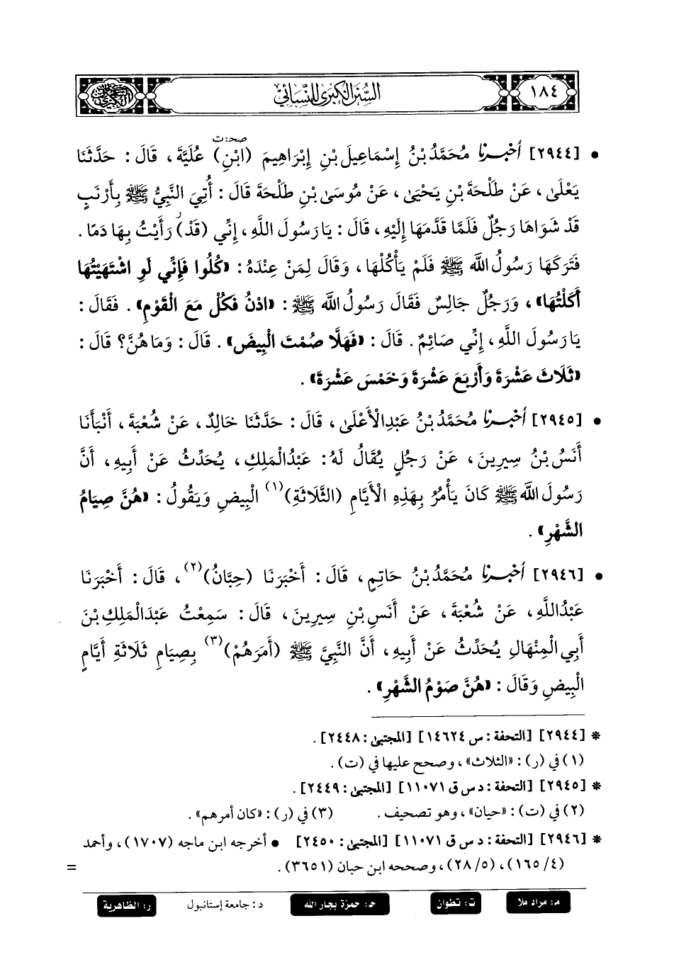 2944- أَخبَرنا مُحَمدُ بنُ إِسمَاعِيلَ بْنِ إِبرَاهِيمَ ابنِ عُلَيَّةَ، قَالَ: حَدثنا يَعْلَى، عَن طَلحَةَ بْنِ يَحيَى، عَن مُوسَى بْنِ طَلحَةَ، قَالَ: أُتِيَ النَّبِيُّ صَلى الله عَليه وسَلم بِأَرْنَبٍ قَدْ شَوَاهَا رَجُلٌ، فَلَمَّا قَدَّمَهَا إِلَيْهِ قَالَ: يَا رَسُولَ اللهِ، إِنِّي قَدْ رَأَيْتُ بِهَا دَمًا، فَتَرَكَهَا رَسُولُ اللهِ صَلى الله عَليه وسَلم، فَلَمْ يَأْكُلْهَا، وَقَالَ لِمَنْ عِنْدَهُ: كُلُوا فَإِنِّي لَوِ اشْتَهَيْتُهَا أَكَلْتُهَا، وَرَجُلٌ جَالِسٌ: فَقَالَ رَسُولُ اللهِ صَلى الله عَليه وسَلم: ادْنُ فَكُلْ مَعَ القَوْمِ، فَقَالَ: يَا رَسُولَ اللهِ، إِنِّي صَائِمٌ، قَالَ: فَهَلاَّ صُمْتَ البِيضَ؟ قَالَ: وَمَا هُنَّ؟ قَالَ: ثَلاثَ عَشْرَةَ، وَأَرْبَعَ عَشْرَةَ، وَخَمْسَ عَشْرَةَ.