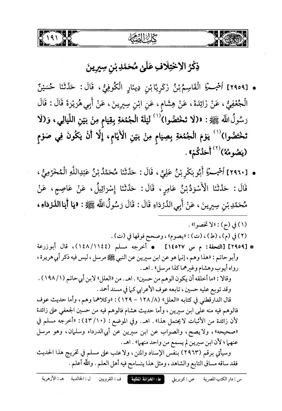 2959- أَخبَرنا القَاسِمُ بنُ زَكَرِيَّا بْنِ دِينَارٍ الكُوفِيُّ، قَالَ: حَدثنا حُسَيْنٌ الجُعْفِيُّ، عَن زَائِدَةَ، عَن هِشَامٍ، عَنِ ابنِ سِيرِينَ، عَن أَبي هُرَيرَةَ، قَالَ: قَالَ رَسُولُ اللهِ صَلى الله عَليه وسَلم: لا تَخْتَصُّوا لَيْلَةَ الجُمُعَةِ بِقِيَامٍ مِنْ بَيْنِ اللَّيَالِي، وَلا تَخْتَصُّوا يَوْمَ الجُمُعَةِ بِصِيَامٍ مِنْ بَيْنِ الأَيَّامِ، إِلاَّ أَنْ يَكُونَ فِي صَوْمٍ يَصُومُهُ أَحَدُكُمْ.