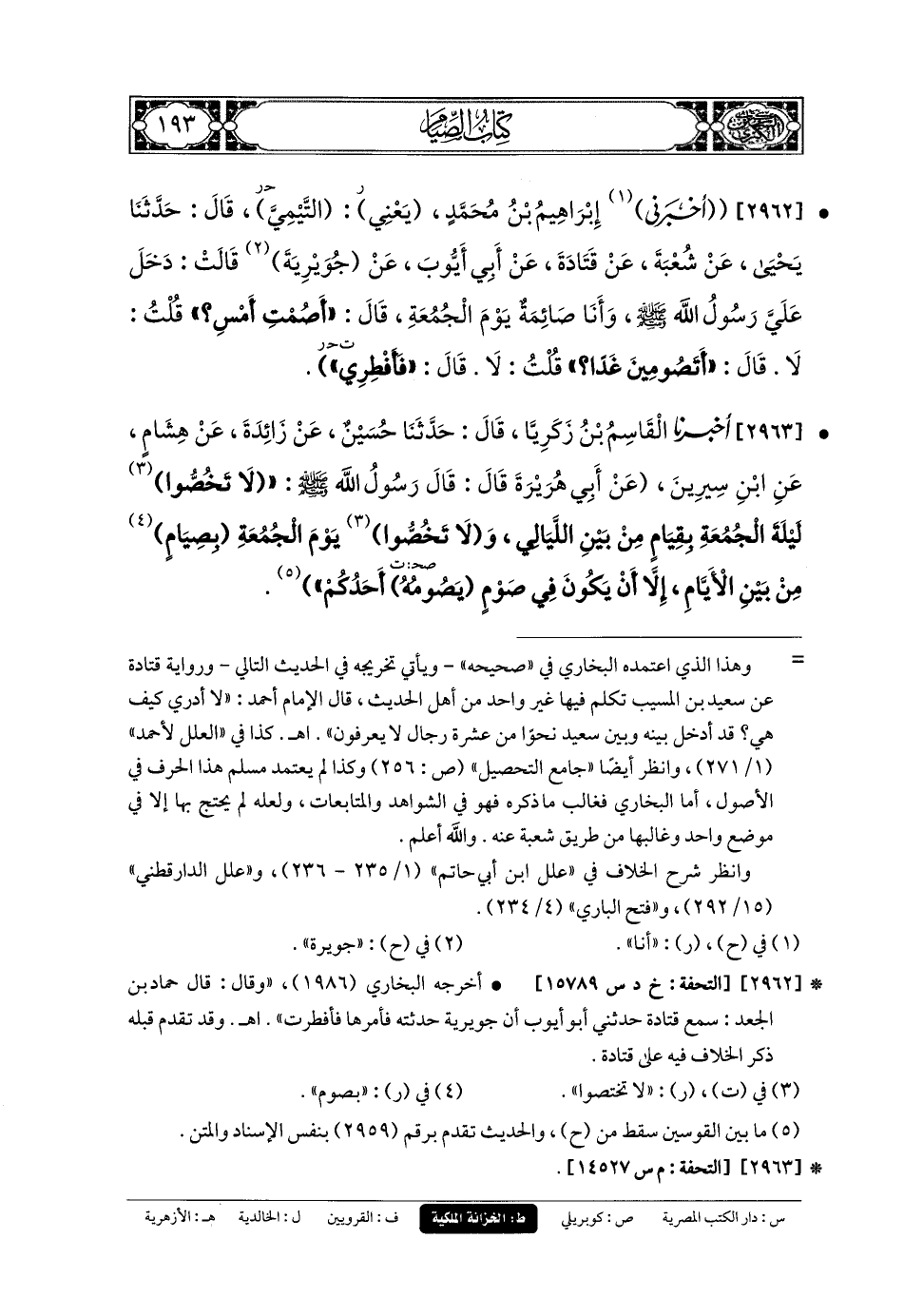 2962- أَخبَرنِي إِبرَاهِيمُ بنُ مُحَمدٍ، يَعْنِي التَّيْمِيَّ، قَالَ: حَدثنا يَحيَى، عَن شُعبَةَ، عَن قَتَادَةَ، عَن أَبي أَيُّوبَ، عَن جُوَيْرِيَةَ، قَالَتْ: دَخَلَ عَلَيَّ رَسُولُ اللهِ صَلى الله عَليه وسَلم وَأَنَا صَائِمَةٌ يَوْمَ الجُمُعَةِ، فَقَالَ: أَصُمْتِ أَمْسِ؟ قُلْتُ: لا، قَالَ: أَتُصُومِينَ غَدًا؟ قُلْتُ: لا، قَالَ: فَأَفْطِرِي.