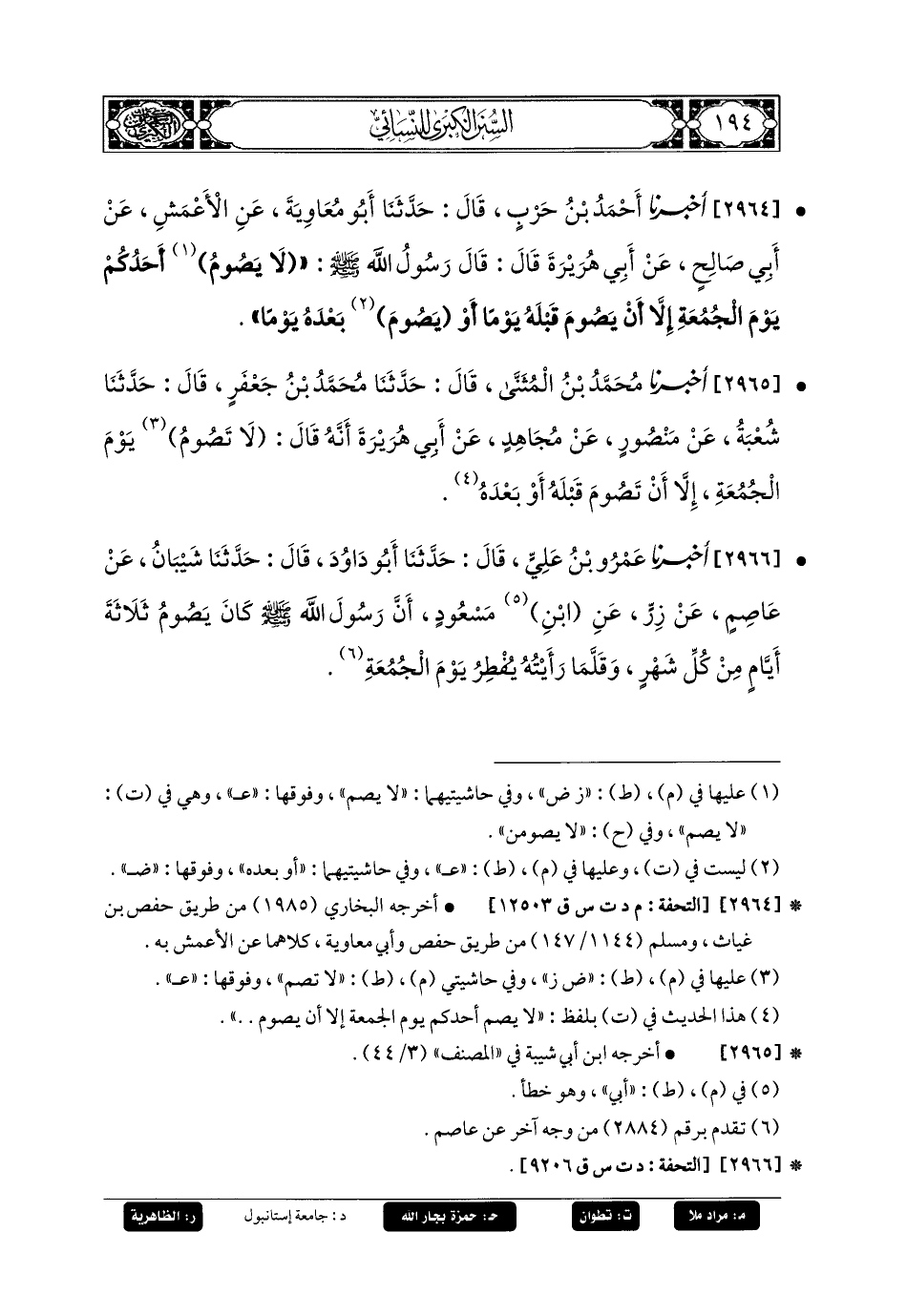 2964- أَخبَرنا أَحْمَدُ بنُ حَرْبٍ، قَالَ: حَدثنا أَبو مُعاويَةَ، عَنِ الأَعْمَشِ، عَن أَبي صَالِحٍ، عَن أَبي هُرَيرَةَ، قَالَ: قَالَ رَسُولُ اللهِ صَلى الله عَليه وسَلم: لا يَصُومُ أَحَدُكُمْ يَوْمَ الجُمُعَةِ، إِلاَّ أَنْ يَصُومَ قَبْلَهُ يَوْمًا أَوْ يَصُومَ بَعْدَهُ يَوْمًا.