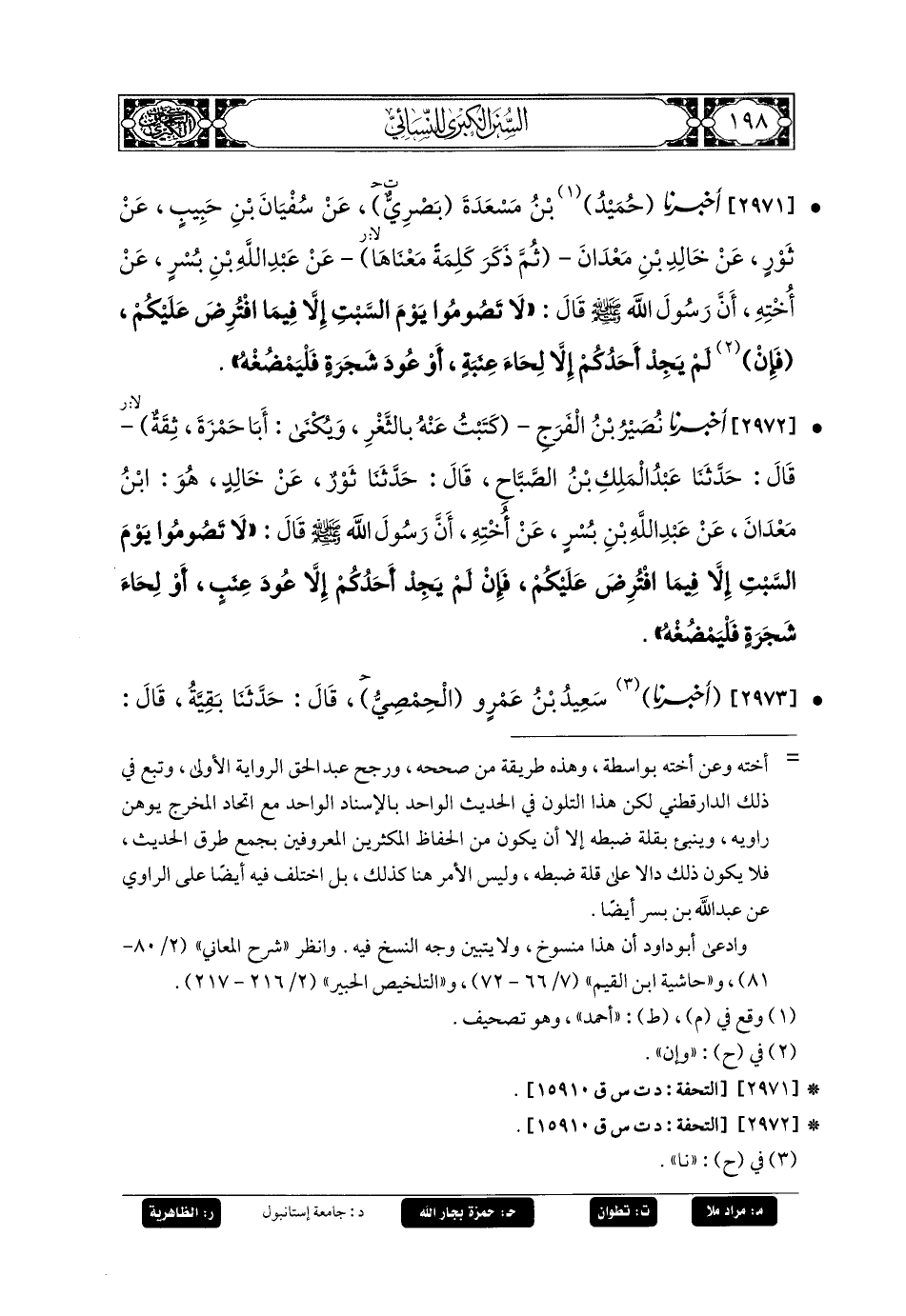 2972- أَخبَرنا نُصَيْرُ بنُ الفَرَجِ، كَتَبْتُ عَنهُ بِالثَّغْرِ، وَيُكْنَى أَبَا حَمْزَةَ، ثِقَةٌ، قَالَ: حَدثنا عَبدُ المَلِكِ بنُ الصَّبَّاحِ، قَالَ: حَدثنا ثَوْرٌ، عَن خَالِدٍ، هُوَ ابنُ مَعْدَانَ، عَن عَبدِ اللهِ بْنِ بُسْرٍ، عَن أُخْتِهِ، أَنَّ رَسُولَ اللهِ صَلى الله عَليه وسَلم قَالَ: لا تَصُومُوا يَوْمَ السَّبْتِ إِلاَّ فِيمَا افْتُرِضَ عَلَيْكُمْ، فَإِنْ لَمْ يَجِدْ أَحَدُكُمْ إِلاَّ عُودَ عِنَبٍ أَوْ لِحَاءَ شَجَرَةٍ فَلْيَمْضُغْهُ.