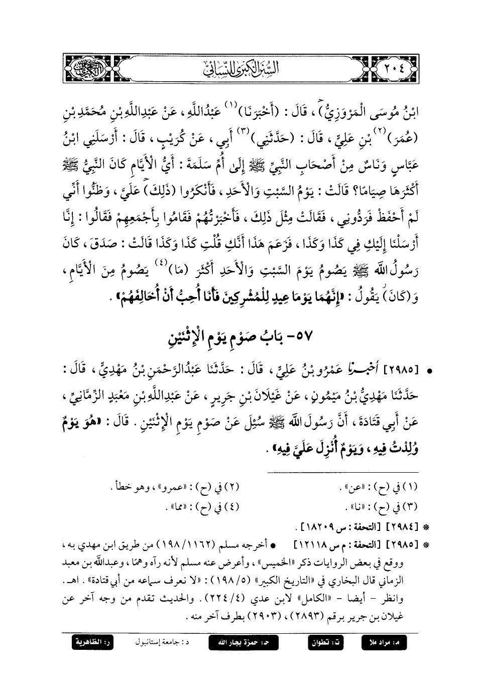 2985- أَخبَرنا عَمرُو بنُ عَليٍّ، قَالَ: حَدثنا عَبدُ الرَّحْمَنِ بنُ مَهْدِيٍّ، قَالَ: حَدثنا مَهْدِيُّ بنُ مَيْمُونٍ، عَن غَيْلانَ بْنِ جَرِيرٍ، عَن عَبدِ اللهِ بْنِ مَعْبَدٍ الزِّمَّانِيِّ، عَن أَبي قَتَادَةَ، أَنَّ رَسُولَ اللهِ صَلى الله عَليه وسَلم سُئِلَ عَن صَوْمِ يَوْمِ الاِثْنَيْنِ، قَالَ: هُوَ يَوْمٌ وُلِدْتُ فِيهِ وَيَوْمٌ أُنْزِلَ عَلَيَّ فِيهِ.