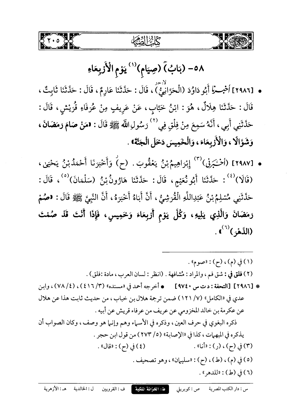 2987- أَخبَرني إِبرَاهِيمُ بنُ يَعقُوبَ (ح) وَأَخبَرنا أَحْمَدُ بنُ يَحيَى، قَالا: حَدثنا أَبو نُعَيْمٍ، قَالَ: حَدثنا هَارُونُ بنُ سَلْمَانَ، قَالَ: حَدَّثَنِي مُسْلِمُ بنُ عَبدِ اللهِ القُرَشِيُّ، أَنَّ أَبَاهُ أَخبَرَهُ؛ أَنَّ النَّبِيَّ صَلى الله عَليه وسَلم قَالَ: صُمْ رَمَضَانَ وَالَّذِي يَلِيهِ، وَكُلَّ يَوْمِ أَرْبِعَاءَ وَخَمِيسٍ، فَإِذًا أَنْتَ قَدْ صُمْتَ الدَّهْرَ.