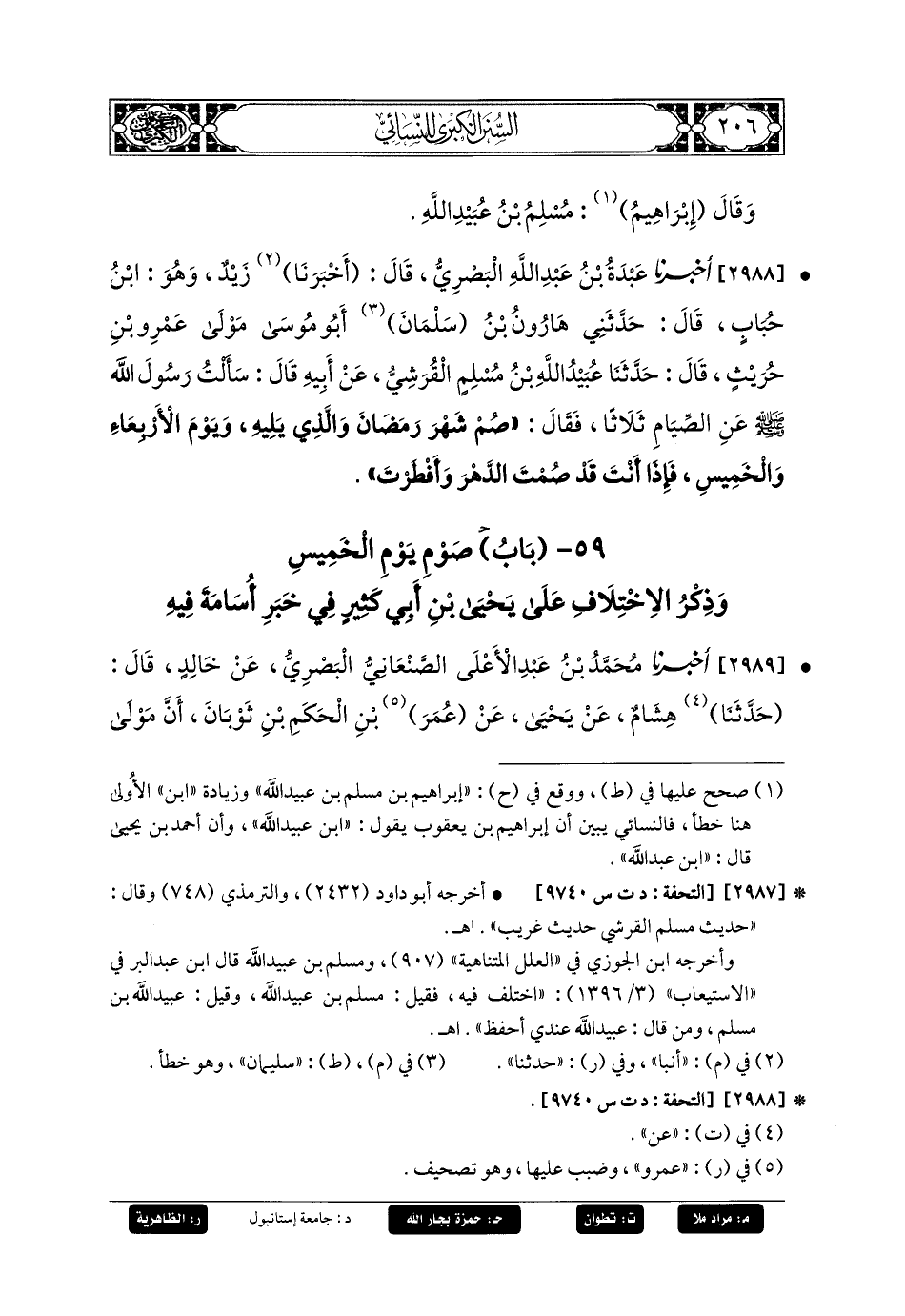 2989- أَخبَرنا مُحَمدُ بنُ عَبدِ الأَعْلَى الصَّنْعَانِيُّ البَصْرِيُّ، عَن خَالِدٍ، قَالَ: حَدثنا هِشَامٌ، عَن يَحيَى، عَن عُمَرَ بْنِ الحَكَمِ بْنِ ثَوْبَانَ، أَنَّ مَوْلَى قُدَامَةَ بْنِ مَظْعُونٍ حَدَّثَهُ، أَنَّ مَوْلَى أُسَامَةَ قَالَ: كَانَ أُسَامَةُ يَرْكَبُ إِلَى مَالٍ لَهُ بِوَادِي القُرَى فَيَصُومُ يَوْمَ الاِثْنَيْنِ وَالخَمِيسِ، قُلْتُ لَهُ: أَتَصُومُ فِي السَّفَرِ، وَقَدْ كَبِرْتَ؟ قَالَ: رَأَيْتُ رَسُولَ اللهِ صَلى الله عَليه وسَلم يَصُومُ يَوْمَ الاِثْنَيْنِ وَالخَمِيسِ، قَالَ: إِنَّ الأَعْمَالَ تُعْرَضُ يَوْمَ الاِثْنَيْنِ وَيَوْمَ الخَمِيسِ.