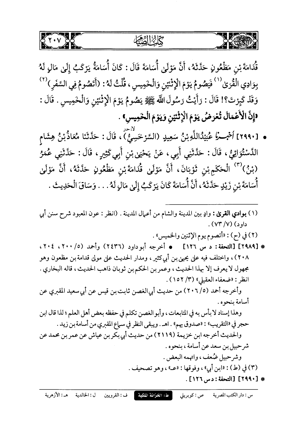 2990- أَخبَرنا عُبَيدُ اللهِ بنُ سَعِيدٍ السَّرَخْسِيُّ، قَالَ: حَدثنا مُعَاذُ بنُ هِشَامٍ الدَّسْتُوَائِيُّ، قَالَ: حَدَّثَنِي أَبي، عَن يَحيَى بْنِ أَبي كَثِيرٍ، قَالَ: حَدَّثَنِي عُمَرُ بنُ الحَكَمِ بْنِ ثَوْبَانَ، أَنَّ مَوْلَى قُدَامَةَ بْنِ مَظْعُونٍ حَدَّثَهُ، أَنَّ مَوْلَى أُسَامَةَ بْنِ زَيْدٍ حَدَّثَهُ، أَنَّ أُسَامَةَ كَانَ يَرْكَبُ إِلَى مَالٍ لَهُ ... وَسَاقَ الحَدِيثَ.