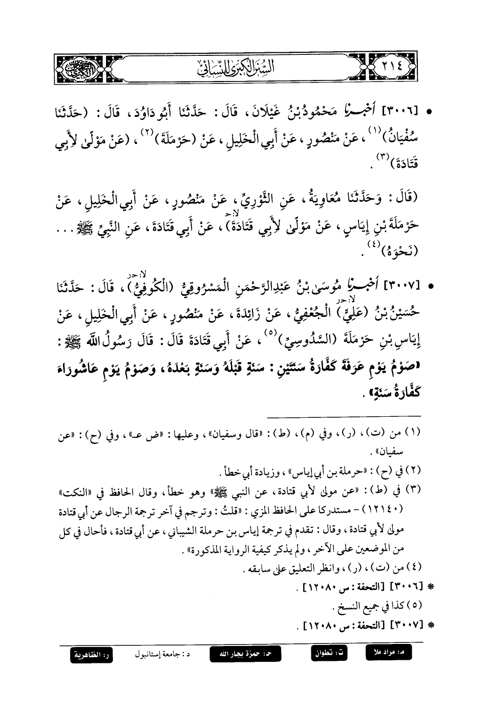 3006- أَخبَرنا مَحْمُودُ بنُ غَيْلانَ، قَالَ: حَدثنا أَبو دَاوُدَ، قَالَ: حَدثنا سُفْيَانُ، عَن مَنصُورٍ، عَن أَبي الخَلِيلِ، عَن حَرْمَلَةَ، عَن مَوْلًى لأَبي قَتَادَةَ، قَالَ: وَحَدثنا مُعاويَةُ، عَنِ الثَّوْرِيِّ، عَن مَنصُورٍ، عَن أَبي الخَلِيلِ، عَن حَرْمَلَةَ بْنِ إِيَاسٍ، عَن مَوْلًى لأَبي قَتَادَةَ، عَن أَبي قَتَادَةَ، عَنِ النَّبِيِّ صَلى الله عَليه وسَلم، نَحْوَهُ.
