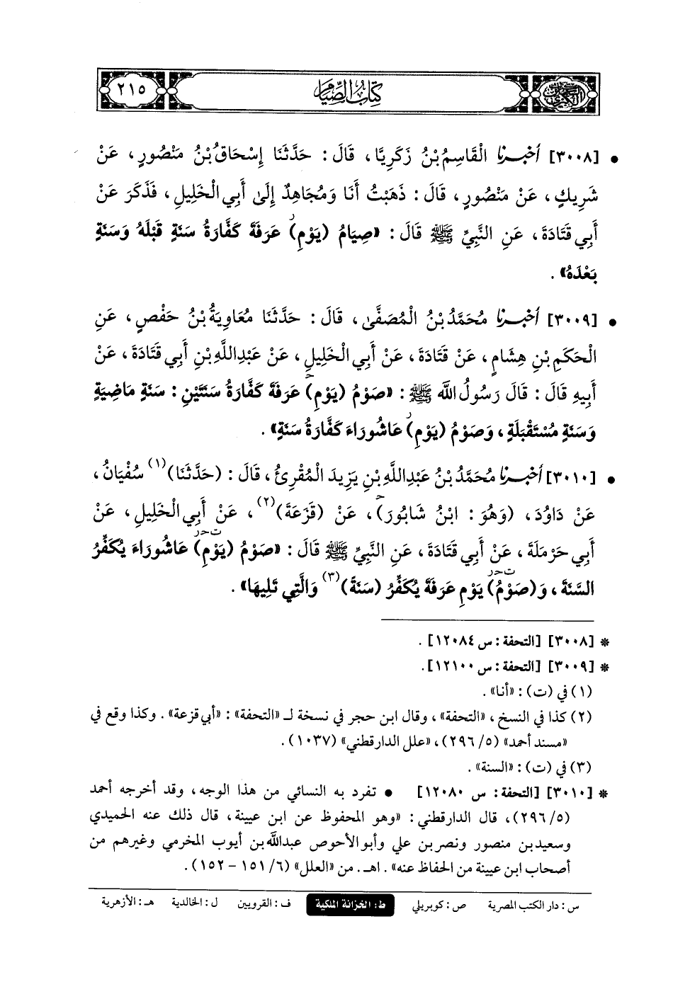 3008- أَخبَرنا القَاسِمُ بنُ زَكَرِيَّا، قَالَ: حَدثنا إِسحَاقُ بنُ مَنصُورٍ، عَن شَرِيكٍ، عَن مَنصُورٍ، قَالَ: ذَهَبْتُ أنا وَمُجَاهِدٌ إِلَى أَبي الخَلِيلِ، فَذَكَرَ عَن أَبي قَتَادَةَ، عَنِ النَّبِيِّ صَلى الله عَليه وسَلم قَالَ: صِيَامُ يَوْمِ عَرَفَةَ كَفَّارَةُ سَنَةٍ قَبْلَهُ وَسَنَةٍ بَعْدَهُ.