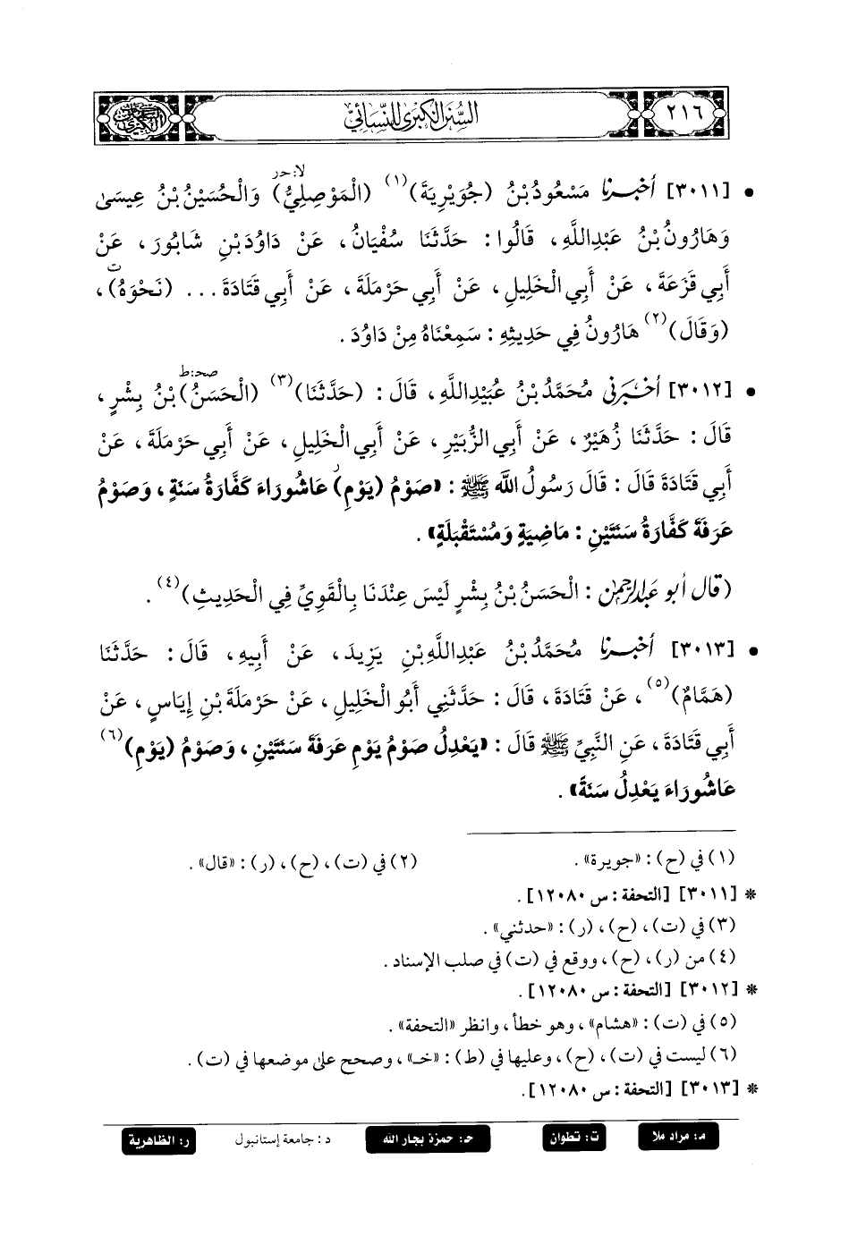 3012- أَخبَرني مُحَمدُ بنُ عُبَيدِ اللهِ، قَالَ: حَدثنا الحَسَنُ بنُ بِشْرٍ، قَالَ: حَدثنا زُهَيْرٌ، عَن أَبي الزُّبَيْرِ، عَن أَبي الخَلِيلِ، عَن أَبي حَرْمَلَةَ، عَن أَبي قَتَادَةَ، قَالَ: قَالَ رَسُولُ اللهِ صَلى الله عَليه وسَلم: صَوْمُ يَوْمِ عَاشُورَاءَ كَفَّارَةُ سَنَةٍ، وَصَوْمُ عَرَفَةَ كَفَّارَةُ سَنَتَيْنِ مَاضِيَةٍ وَمُسْتَقْبَلَةٍ.