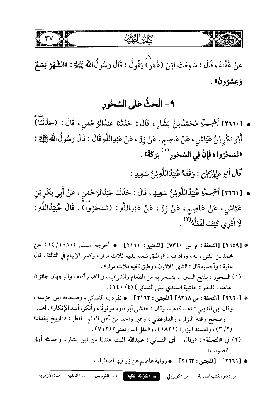 2661- أَخبَرنا عُبَيدُ اللهِ بنُ سَعِيدٍ، قَالَ: حَدثنا عَبدُ الرَّحْمَنِ، عَن أَبي بَكْرِ بْنِ عَيَّاشٍ، عَن عَاصِمٍ، عَن زِرٍّ، عَن عَبدِ اللهِ: تَسَحَّرُوا، قَالَ عُبَيدُ اللهِ: لا أَدْرِي كَيْفَ لَفْظُهُ.