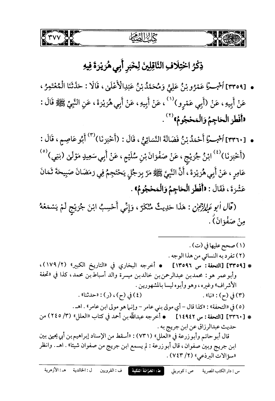 3360- أَخبَرنا أَحْمَدُ بنُ فَضَالَةَ النَّسَائِيُّ، قَالَ: أَخبَرنا أَبو عَاصِمٍ، قَالَ: أَخبَرنا ابنُ جُرَيْجٍ، عَن صَفْوَانَ بْنِ سُلَيْمٍ، عَن أَبي سَعِيدٍ، مَوْلَى بَنِي عَامِرٍ، عَن أَبي هُرَيرَةَ، أَنَّ النَّبِيَّ صَلى الله عَليه وسَلم مَرَّ بِرَجُلٍ يَحْتَجِمُ فِي رَمَضَانَ صَبِيحَةَ ثَمَانَ عَشْرَةَ، فَقَالَ: أَفْطَرَ الحَاجِمُ وَالمَحْجُومُ.