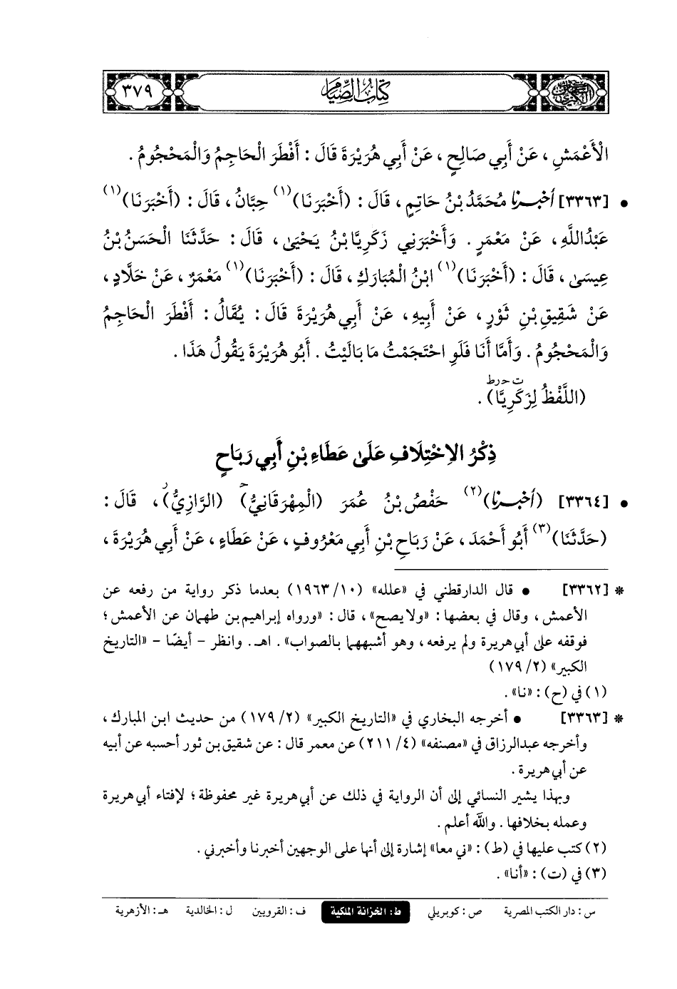 3363- أَخبَرنا مُحَمدُ بنُ حَاتِمٍ، قَالَ: أَخبَرنا حِبَّانُ، قَالَ: أَخبَرنا عَبدُ اللهِ، عَن مَعْمَرٍ. وَأَخبَرني زَكَرِيَّا بنُ يَحيَى، قَالَ: حَدثنا الحَسَنُ بنُ عِيسَى، قَالَ: أَخبَرنا ابنُ المُبَارَكِ، قَالَ: أَخبَرنا مَعْمَرٌ، عَن خَلاَّدٍ، عَن شَقِيقِ بْنِ ثَوْرٍ، عَن أَبيهِ، عَن أَبي هُرَيرَةَ، قَالَ: يُقَالُ: أَفْطَرَ الحَاجِمُ وَالمَحْجُومُ، وَأَمَّا أَنَا فَلَوِ احْتَجَمْتُ مَا بَالَيْتُ، أَبو هُرَيرَةَ يَقُولُ هَذَا اللَّفْظُ لِزَكَرِيَّا.