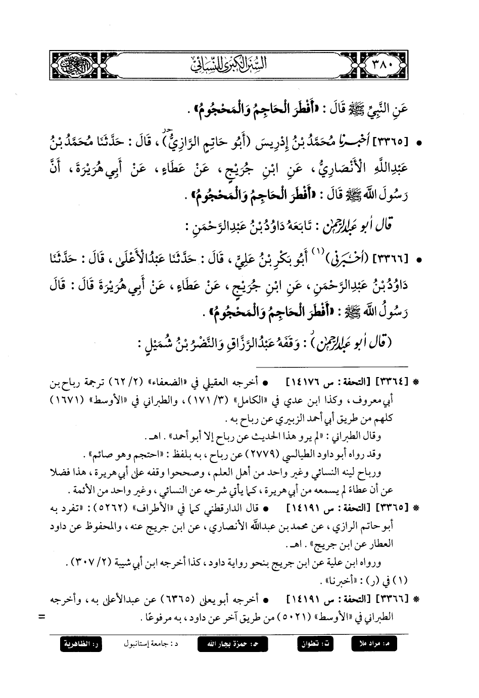 3365- أَخبَرنا مُحَمدُ بنُ إِدرِيسَ أَبو حَاتِمٍ الرَّازِيُّ، قَالَ: حَدثنا مُحَمدُ بنُ عَبدِ اللهِ الأَنْصَارِيُّ، عَنِ ابنِ جُرَيْجٍ، عَن عَطَاءٍ، عَن أَبي هُرَيرَةَ، أَنَّ رَسُولَ اللهِ صَلى الله عَليه وسَلم قَالَ: أَفْطَرَ الحَاجِمُ وَالمَحْجُومُ.