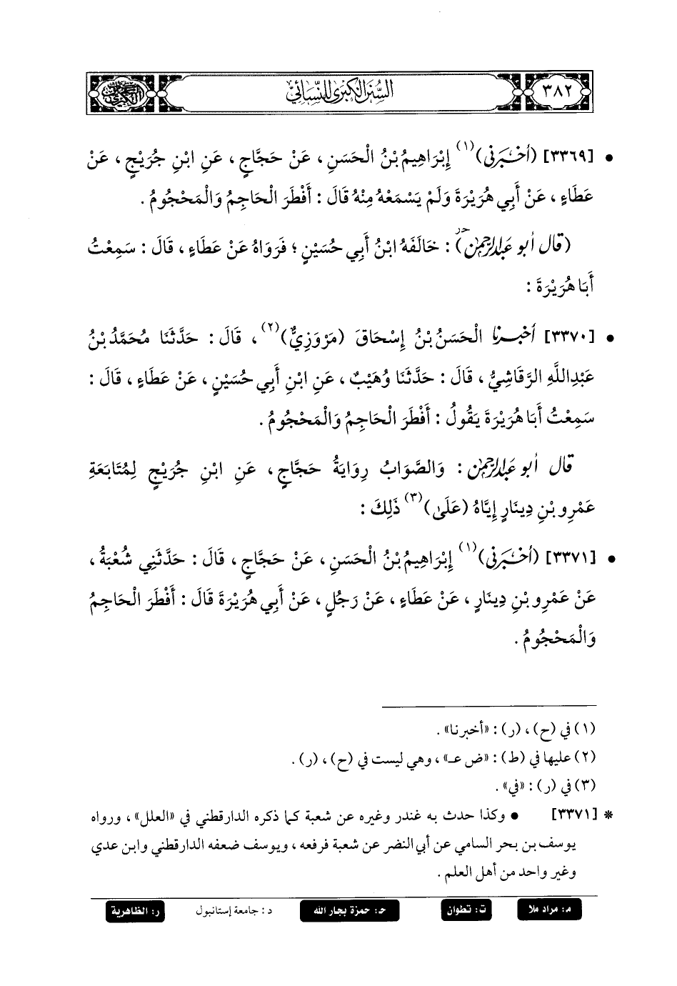 3370- أَخبَرنا الحَسَنُ بنُ إِسحَاقَ، مَرْوَزِيٌّ، قَالَ: حَدثنا مُحَمدُ بنُ عَبدِ اللهِ الرَّقَاشِيُّ، قَالَ: حَدثنا وُهَيْبٌ، عَنِ ابنِ أَبي حُسَيْنٍ، عَن عَطَاءٍ، قَالَ: سَمِعْتُ أَبَا هُرَيرَةَ، يَقُولُ: أَفْطَرَ الحَاجِمُ وَالمَحْجُومُ.