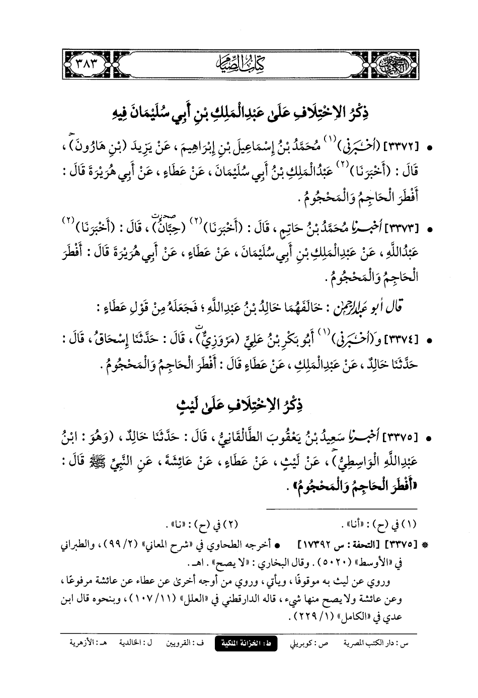3374- وَأَخبَرني أَبو بَكْرِ بنُ عَليٍّ، مَرْوَزِيٌّ، قَالَ: حَدثنا إِسحَاقُ، قَالَ: حَدثنا خَالِدٌ، عَن عَبدِ المَلِكِ، عَن عَطَاءٍ، قَالَ: أَفْطَرَ الحَاجِمُ وَالمَحْجُومُ.