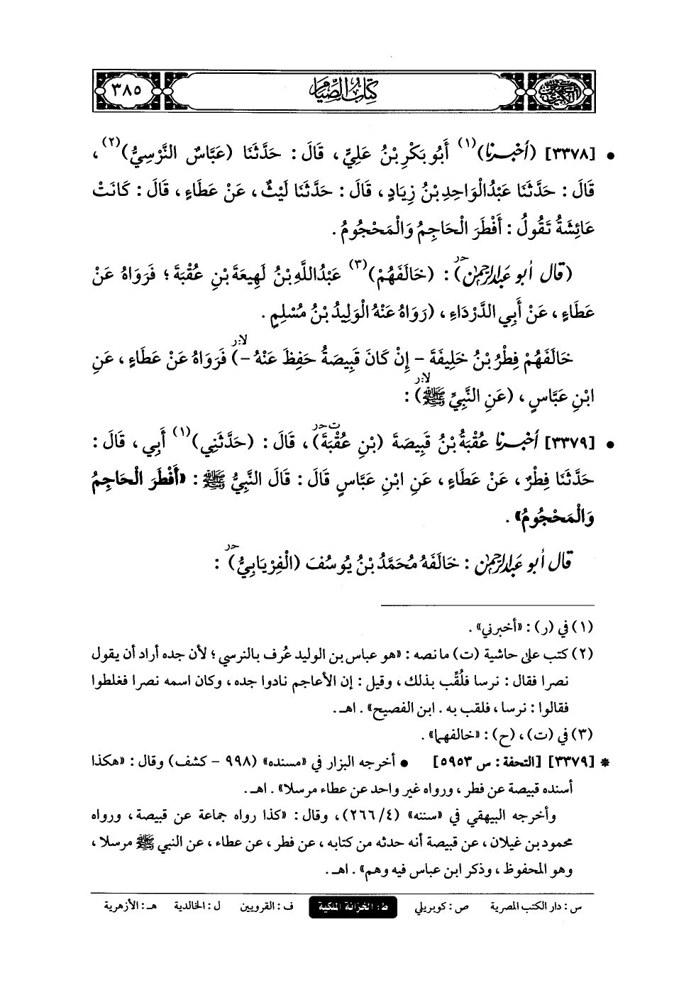 3379- أَخبَرنا عُقْبَةُ بنُ قَبِيصَةَ بْنِ عُقْبَةَ، قَالَ: حَدَّثَنِي أَبي، قَالَ: حَدثنا فِطْرٌ، عَن عَطَاءٍ، عَنِ ابنِ عَبَّاسٍ، قَالَ: قَالَ النَّبِيُّ صَلى الله عَليه وسَلم: أَفْطَرَ الحَاجِمُ وَالمَحْجُومُ.