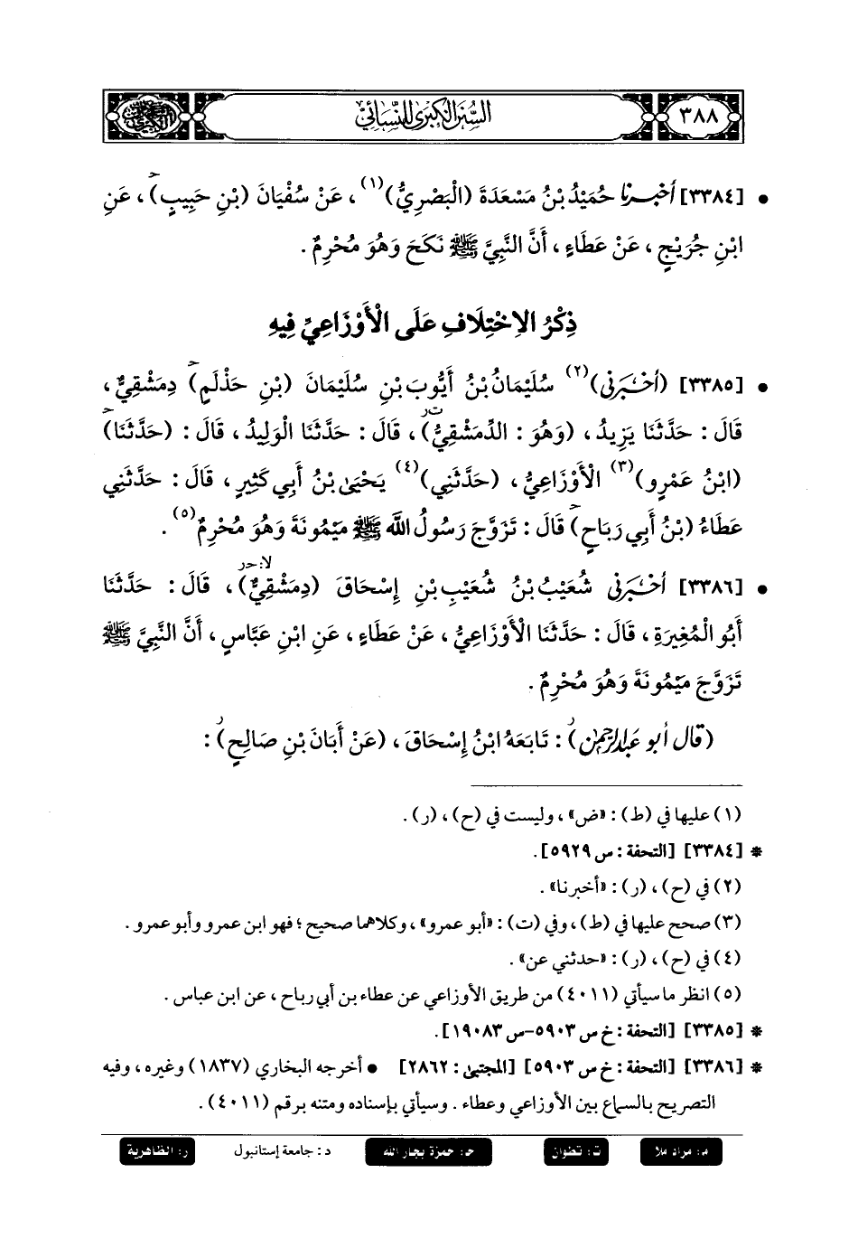 3386- أَخبَرني شُعَيبُ بنُ شُعَيبِ بْنِ إِسحَاقَ، دِمَشْقِيٌّ، قَالَ: حَدثنا أَبو المُغِيرَةِ، قَالَ: حَدثنا الأَوْزَاعِيُّ، عَن عَطَاءٍ، عَنِ ابنِ عَبَّاسٍ، أَنَّ النَّبِيَّ صَلى الله عَليه وسَلم تَزَوَّجَ مَيْمُونَةَ وَهُوَ مُحْرِمٌ.