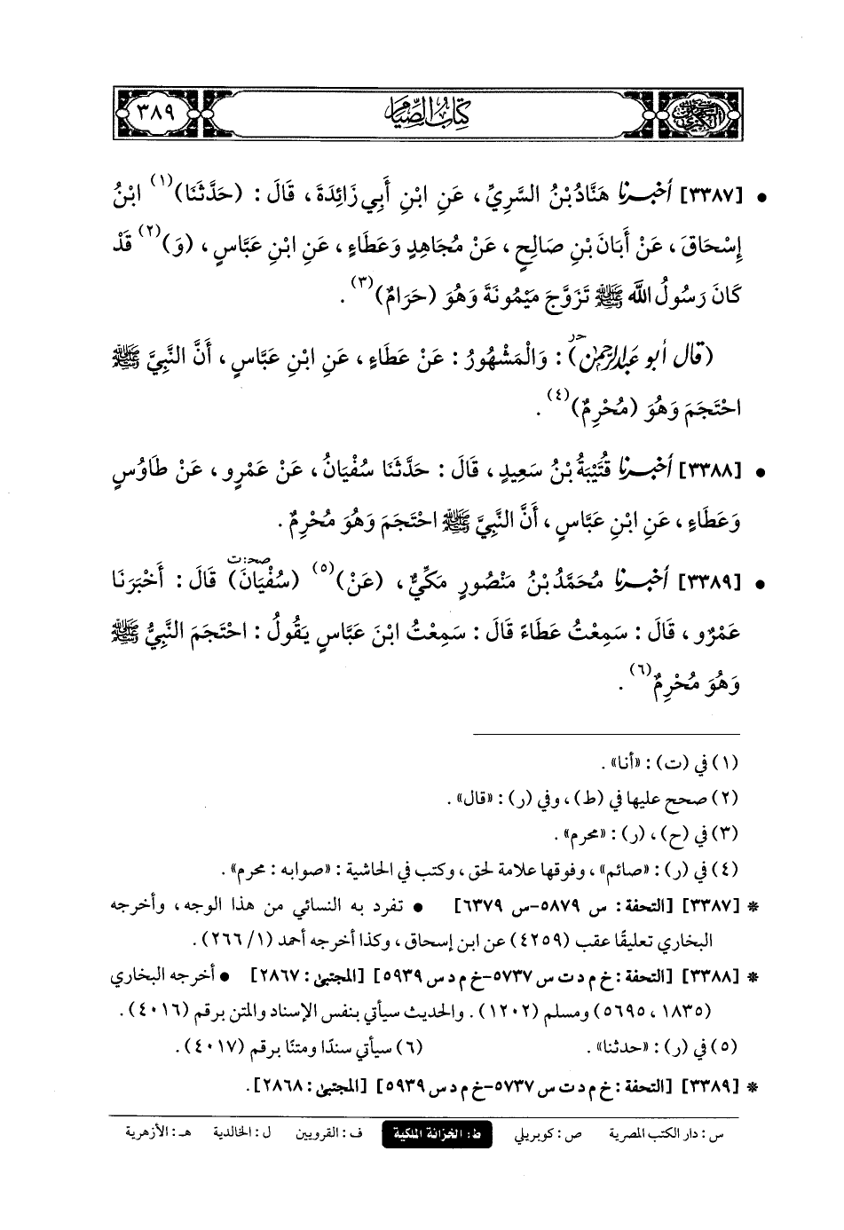 3387- أَخبَرنا هَنَّادُ بنُ السَّرِيِّ، عَنِ ابنِ أَبي زَائِدَةَ، قَالَ: حَدثنا ابنُ إِسحَاقَ، عَن أَبَانَ بْنِ صَالِحٍ، عَن مُجَاهِدٍ، وَعَطَاءٍ، عَنِ ابنِ عَبَّاسٍ؛ وَقَدْ كَانَ رَسُولُ اللهِ صَلى الله عَليه وسَلم تَزَوَّجَ مَيْمُونَةَ وَهُوَ حَرَامٌ.